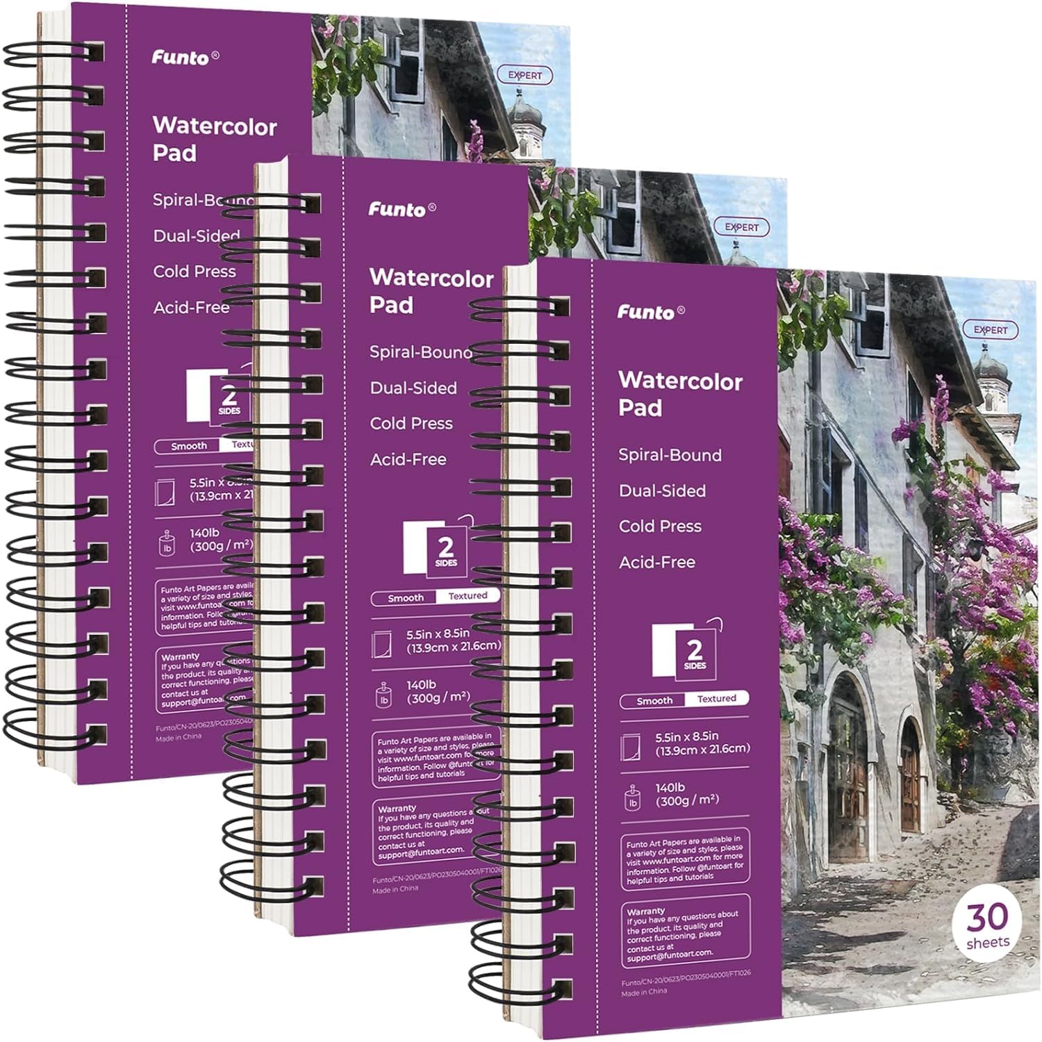 Funto Watercolor Pad 5.5x8.5, 3 Pack, 90 Sheets,140lb/300gsm, Double-Sided, Cold Press, Spiral Bound, Heavyweight Paper for Watercolor Painting