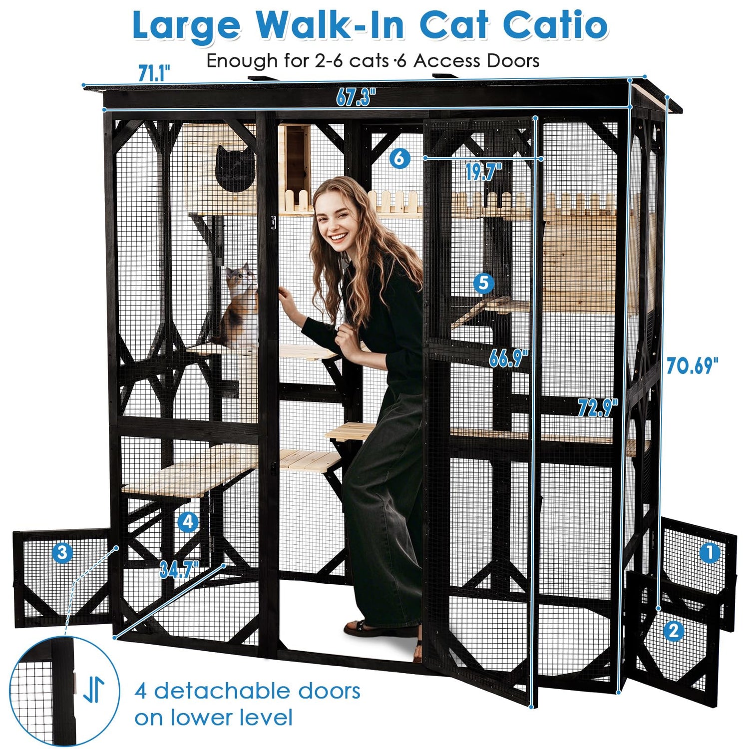 FunXplore 71.1" L Large Cat Catio Outdoor Cat Enclosure Window Acess, Walk-in Cat Cage Cat House for Multiple Indoor Outdoor Cats, Outside Patio 6 Doors Weatherproof Roof