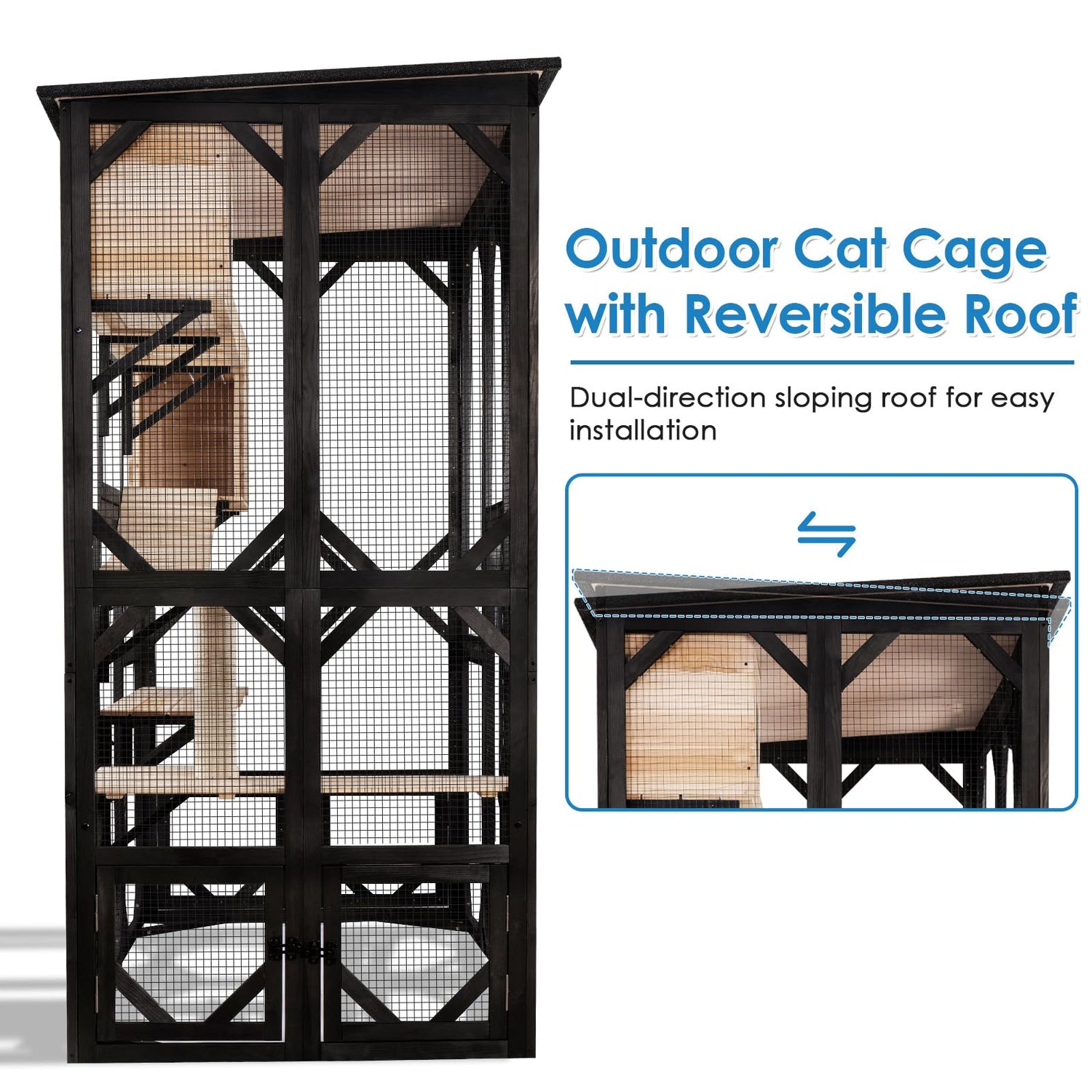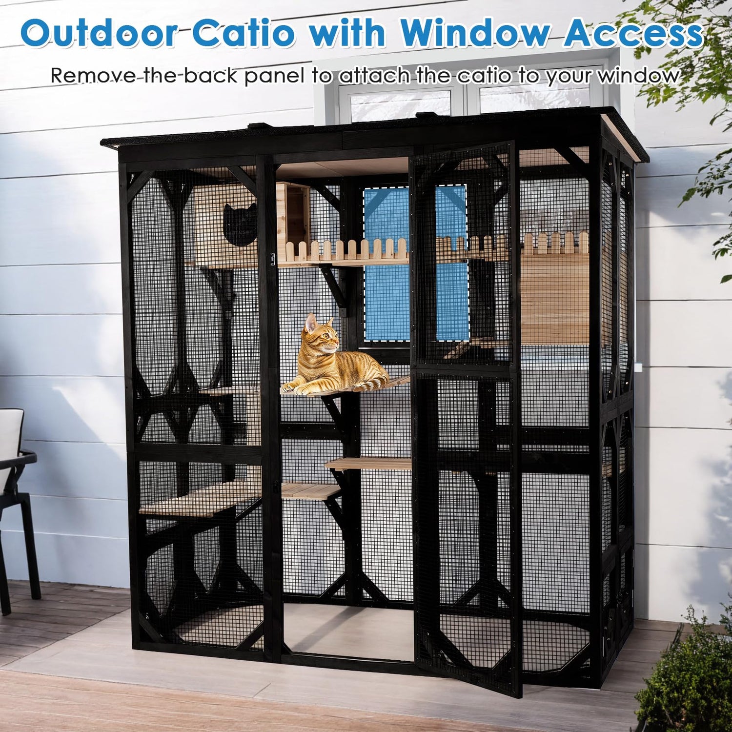 - Multi-Cat Cage Outdoor: This 8-cat capacity catio features 4 multi-tiered observation decks, an sisal scratching post, dual hideaways, and an aerial crossing bridge. The catio is perfect for climbing, birdwatching naps, or sprawling sun puddles