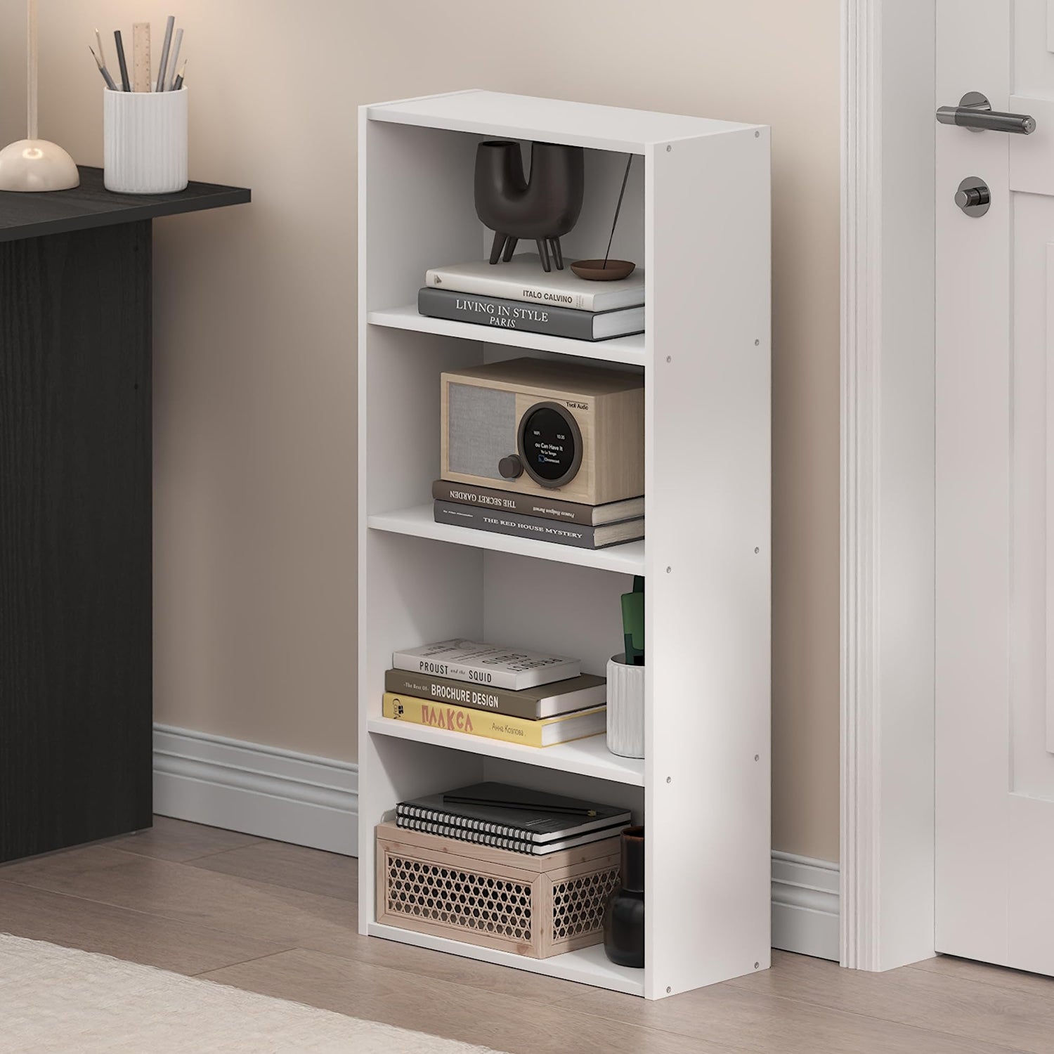 Details: The Furinno Basic 4-Tier Open Shelf Bookcase is a functional and versatile bookshelf, storage organizer, and display shelf designed to keep your home or office tidy and stylish. Featuring durable engineered wood and open shelving, this compact bookcase is ideal for storing books, décor, plants, baskets, and other essentials in living rooms, bedrooms, home offices, dorm rooms, or apartments. With multiple size options and a space-saving design, this bookshelf fits perfectly in small spaces while adding practical storage and modern style to any room. The Bookcase is made of CARB-grade composite wood tested for durability and sturdiness. Assembly is easy with provided step-by-step instructions. Care instructions: wipe clean with a clean damped cloth. Avoid using harsh chemicals. Pictures are for illustration purposes. All decor items are not included in this offer. The product is entitled to a 1-year warranty against manufacturer defects. Fits Space, Fits Budget.
