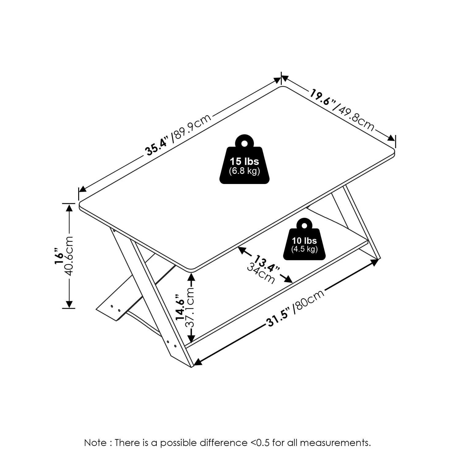 - Top shelf holds up to 20lbs, bottom shelf holds up 10lbs.