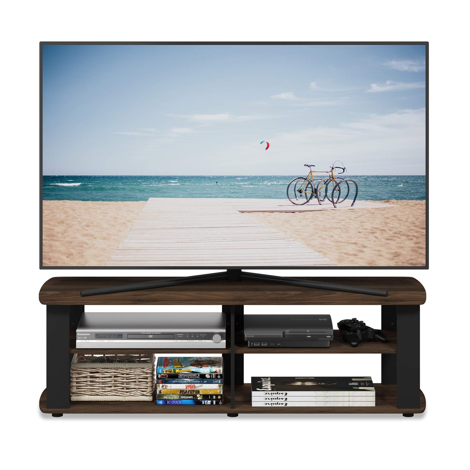FURINNO Nelly Entertainment Center TV Stand, Short 43.3"(W) x13.4(H) x13.1(D), Columbia Walnut/Black
