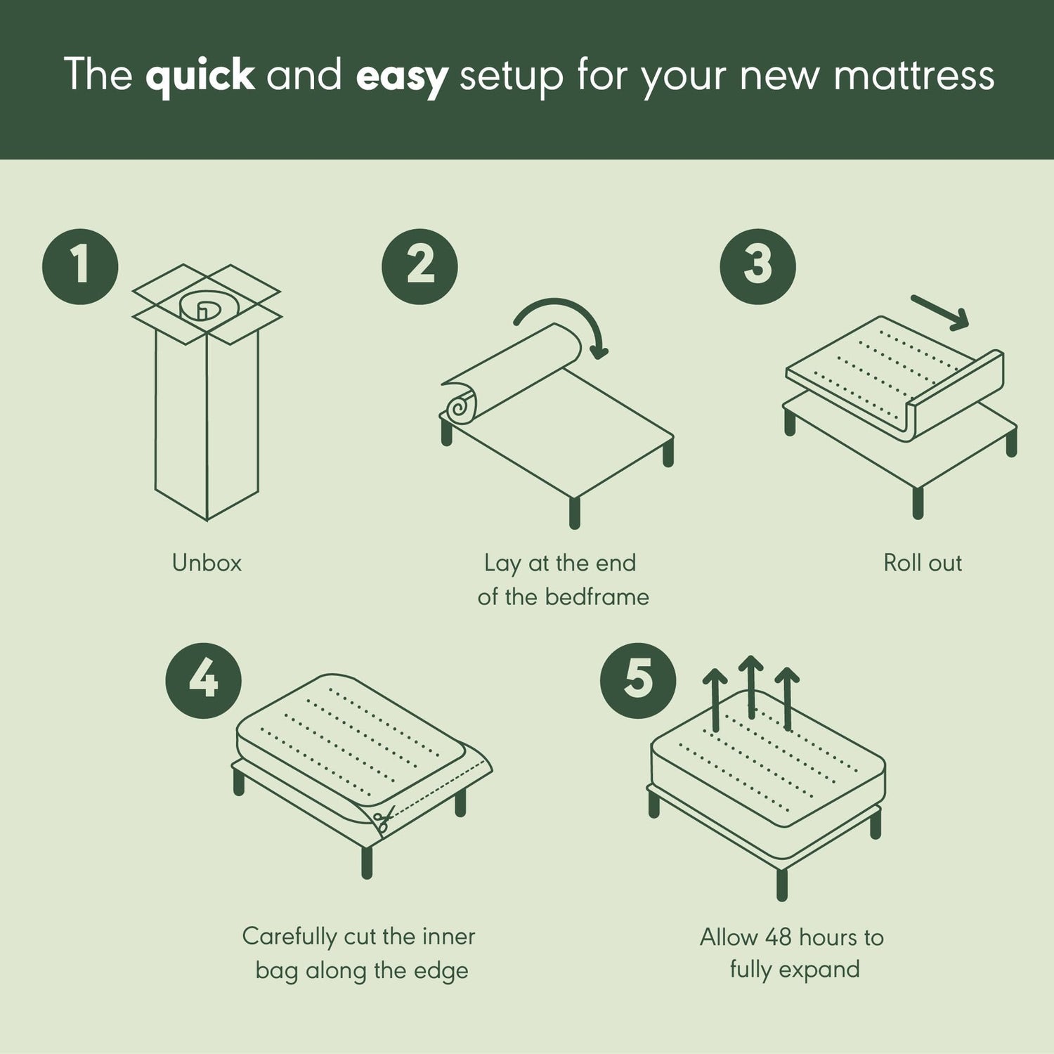 - The mattress is compressed and packed into a box for easy setup. Simply unbox, unroll it, and within 72 hours it will return to its original shape.