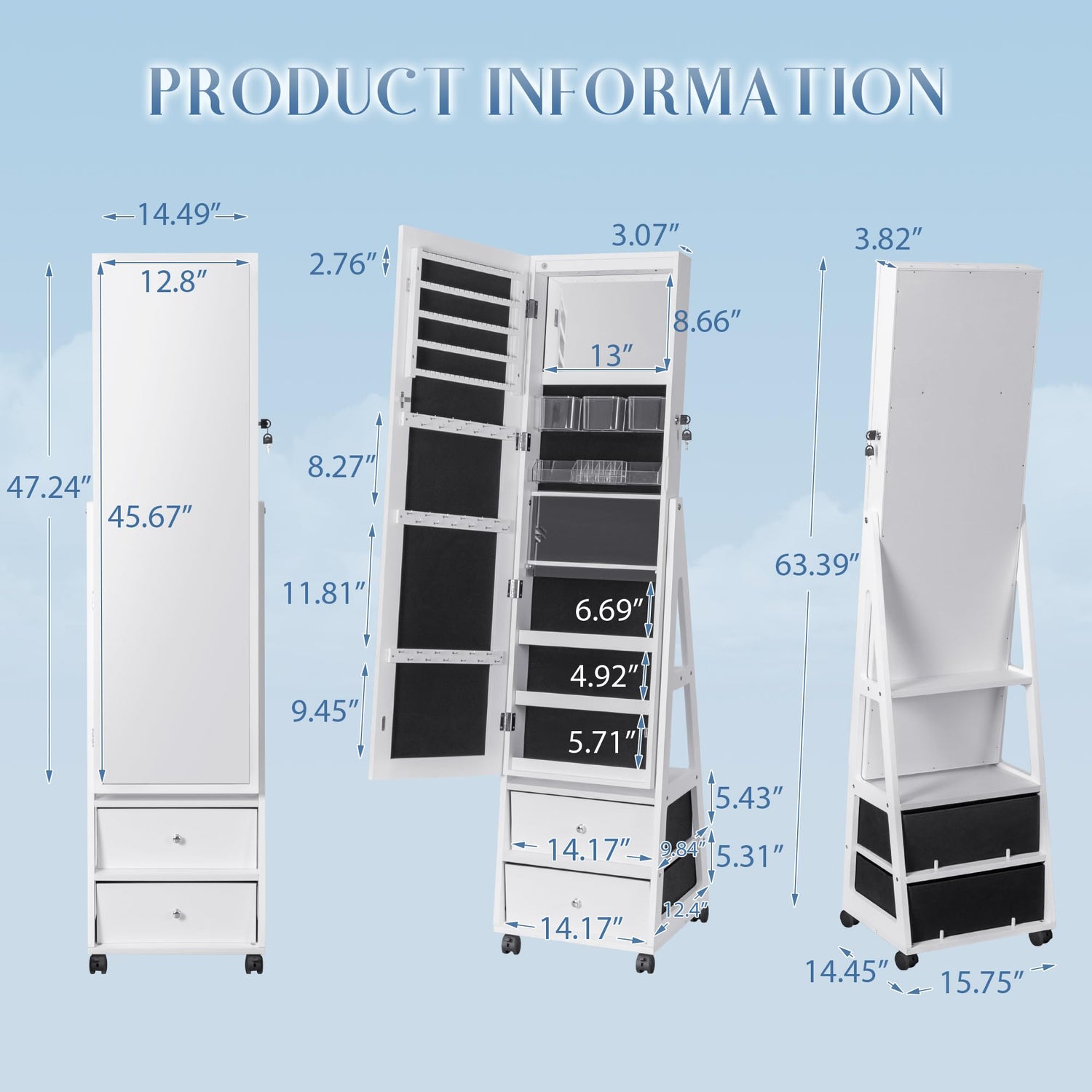 - 360° Swivel Jewelry Cabinet: The mirror jewelry armoire equipped with 4 directional wheels, which is convenient for us move anywhere smoothly. The lockable casters prevents the jewelry cabinet from sliding