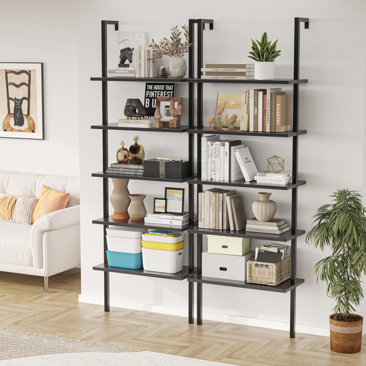 Furmax 5-Tier Bookshelf, Wall Mount Ladder Shelf with Wood Board and Industrial Metal Frame, for Home Office, Living Room, Bedroom, Entryway and Hallway