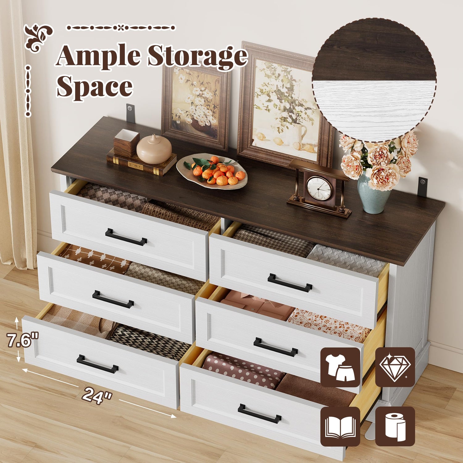 Furmax Farmhouse Dresser for Bedroom, 6 Drawers Dresser, Wood Chest of Drawers, 52" Wide Storage Dressers Organizer for Bedroom, Living Room, White and Brown