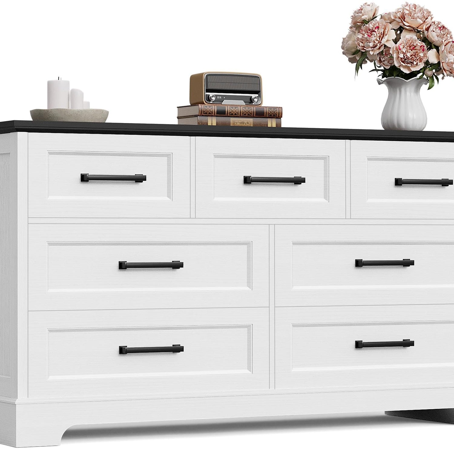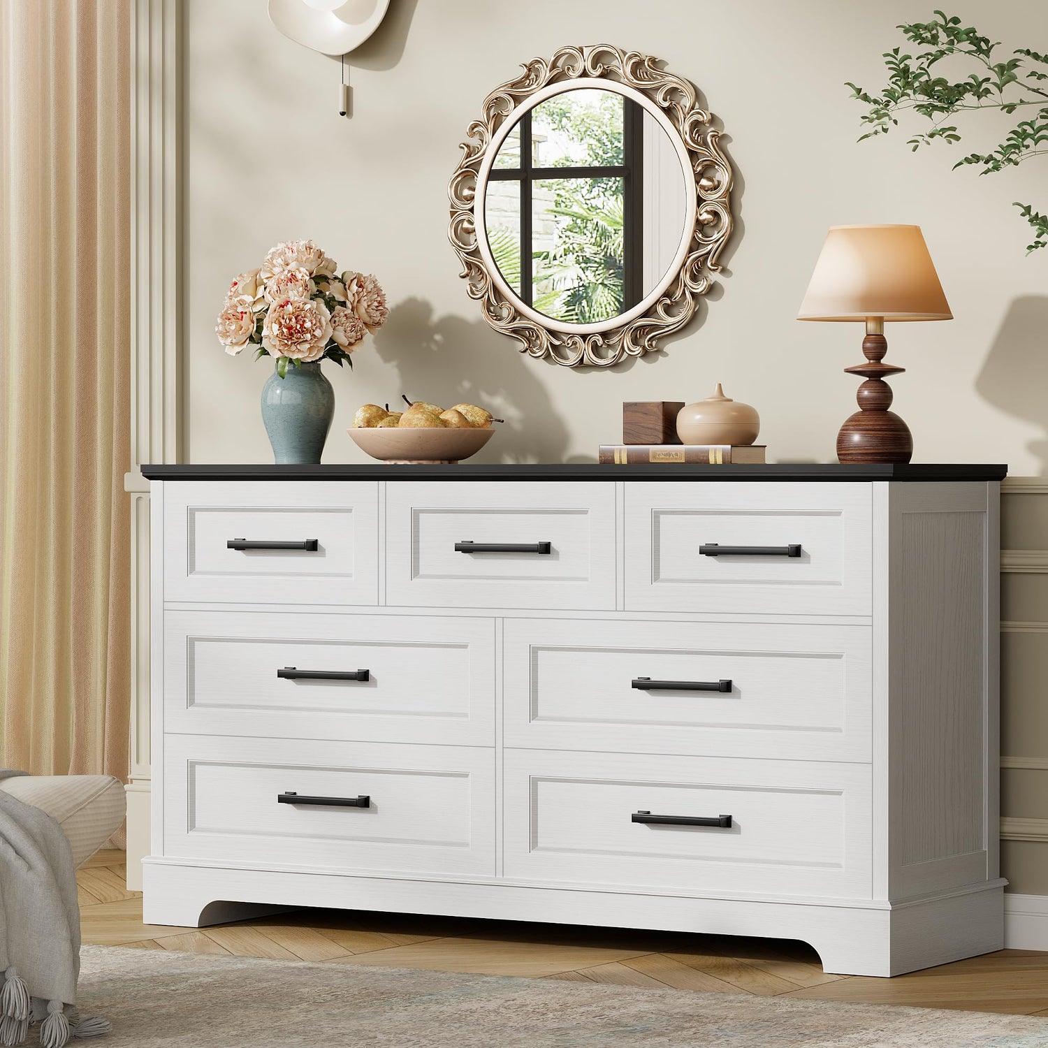 Furmax Farmhouse Dresser for Bedroom, 7 Drawers Dresser, Wood Chest of Drawers, 52" Wide Storage Dressers Organizer for Bedroom, Living Room, White and Black