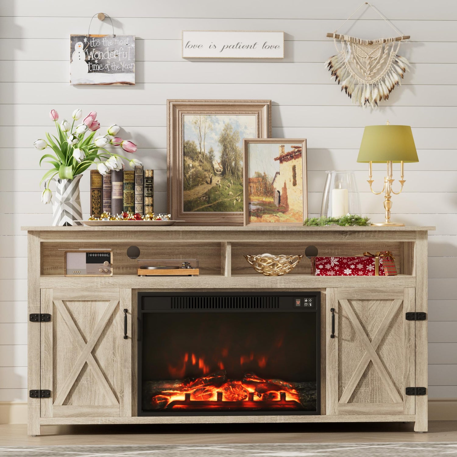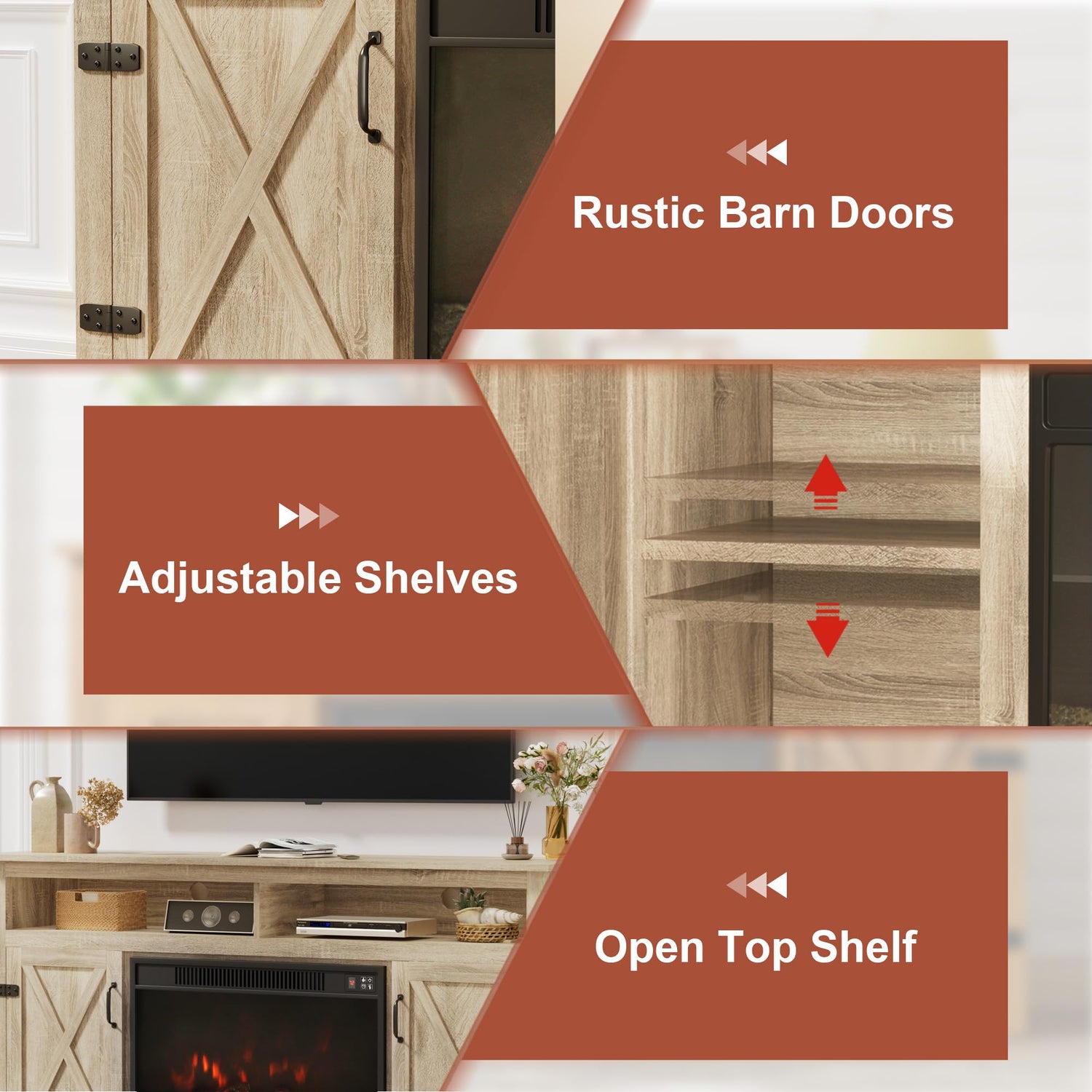 Furmax Farmhouse Fireplace TV Stand for TVs Up to 65 Inch Highboy Entertainment Center with Open Storage and Side Cabinets Rustic Media Console Table with Barn Doors for Living Room (Natural Oak)