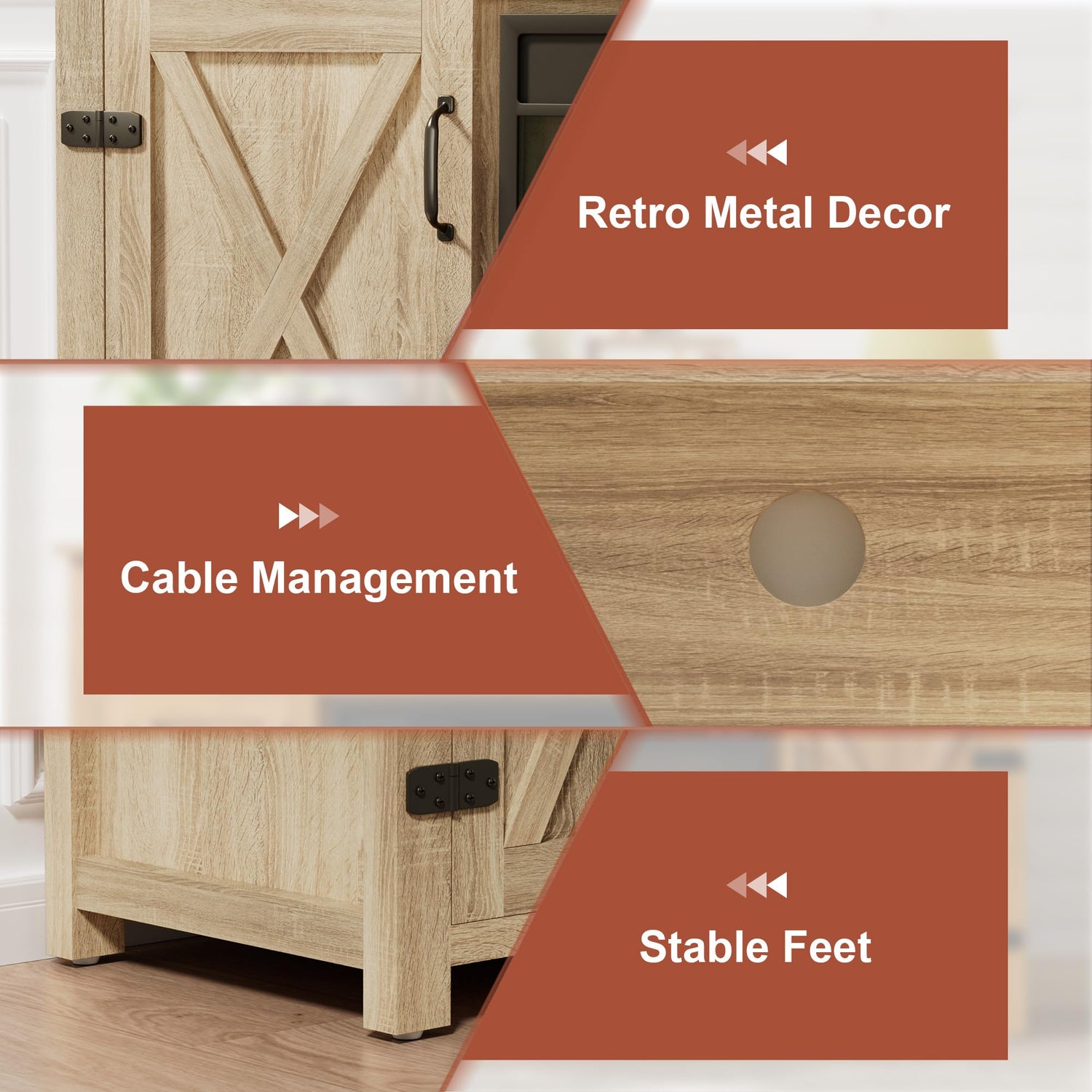 - Highboy Entertainment Center: The 30 inches highboy media console table with rustic style and rich texture wood color, would effortlessly complement different interior styles, creating a cozy warm vibe and elevating your beloved home. Also, the grooved barn door elements match with retro metal handles for an eye for elegance, decorating a warm and comfortable living room.