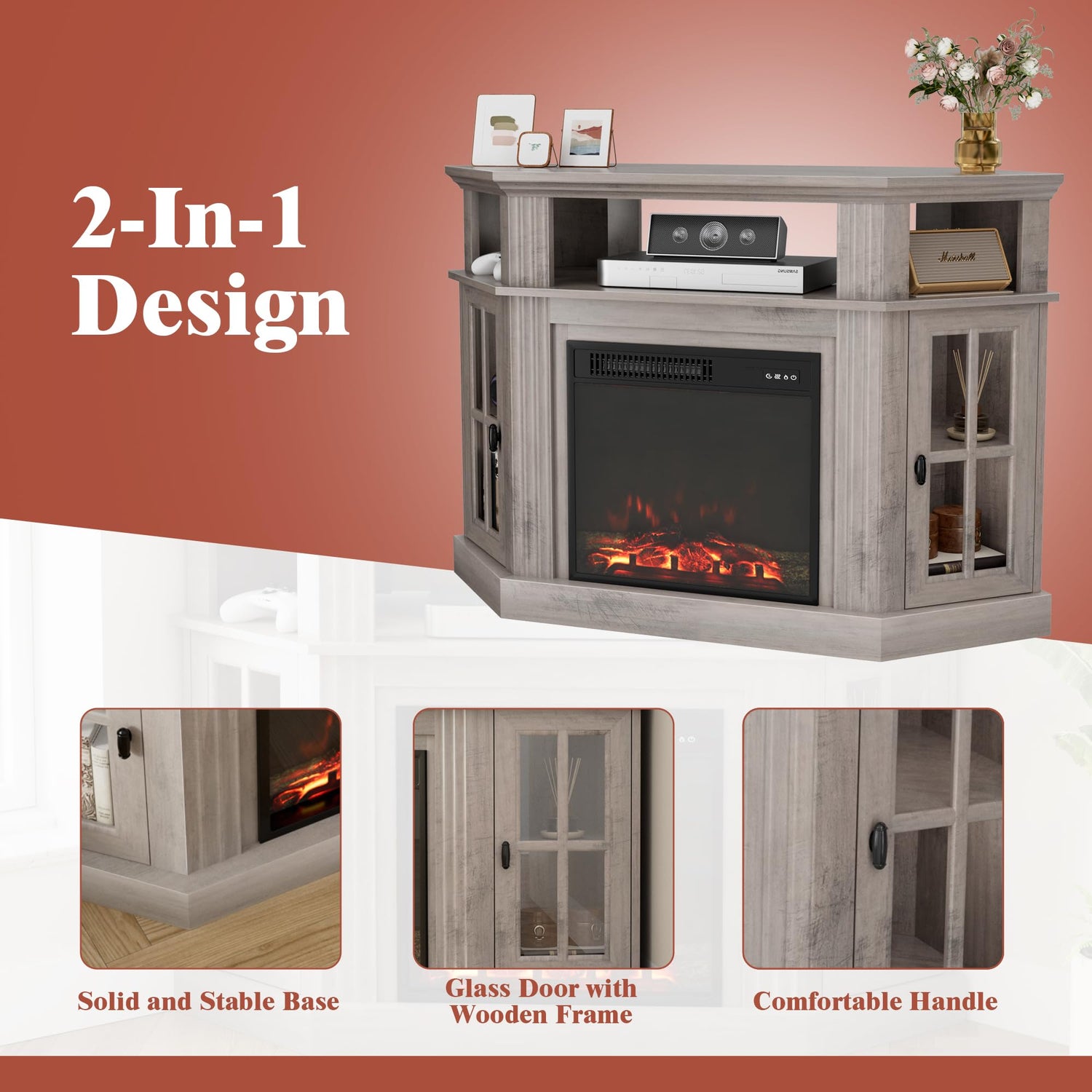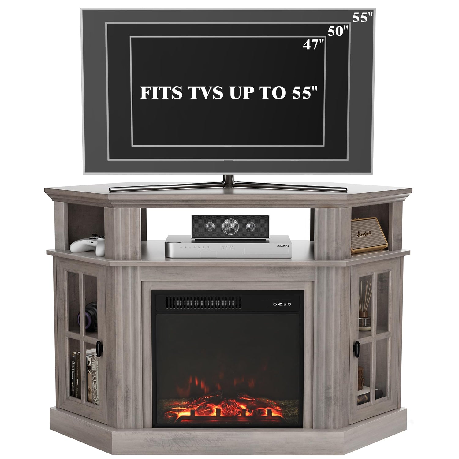 Furmax Fireplace Corner TV Stand for TV Up to 55 Inch, Modern TV Console with 18 Inch Electric Fireplace, Entertainment Center with Open Shelf and Storage Cabinets for Living Room, Rustic Oak