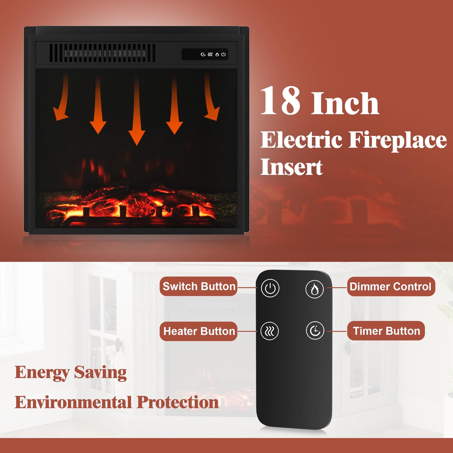Inserted 18 inch electric fireplace has Heater, Timer, Dimmer function.