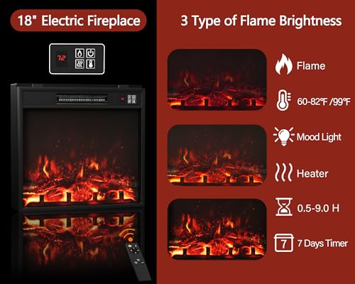 - 18" LED Ambiance Fireplace Insert:This electric fireplace insert is more energy-efficient and environmentally friendly than traditional fireplaces. Simply plug it into a standard 110-120V/15A electrical outlet for operation. The included remote control allows you to easily adjust the heater, timer, and dimmer functions. Create the perfect ambiance with 14 levels of adjustable mood lighting and realistic vertical flames. Safety Note: To prevent overheating, the cooling fan will continue to operate for 30 seconds after the heater is turned off.