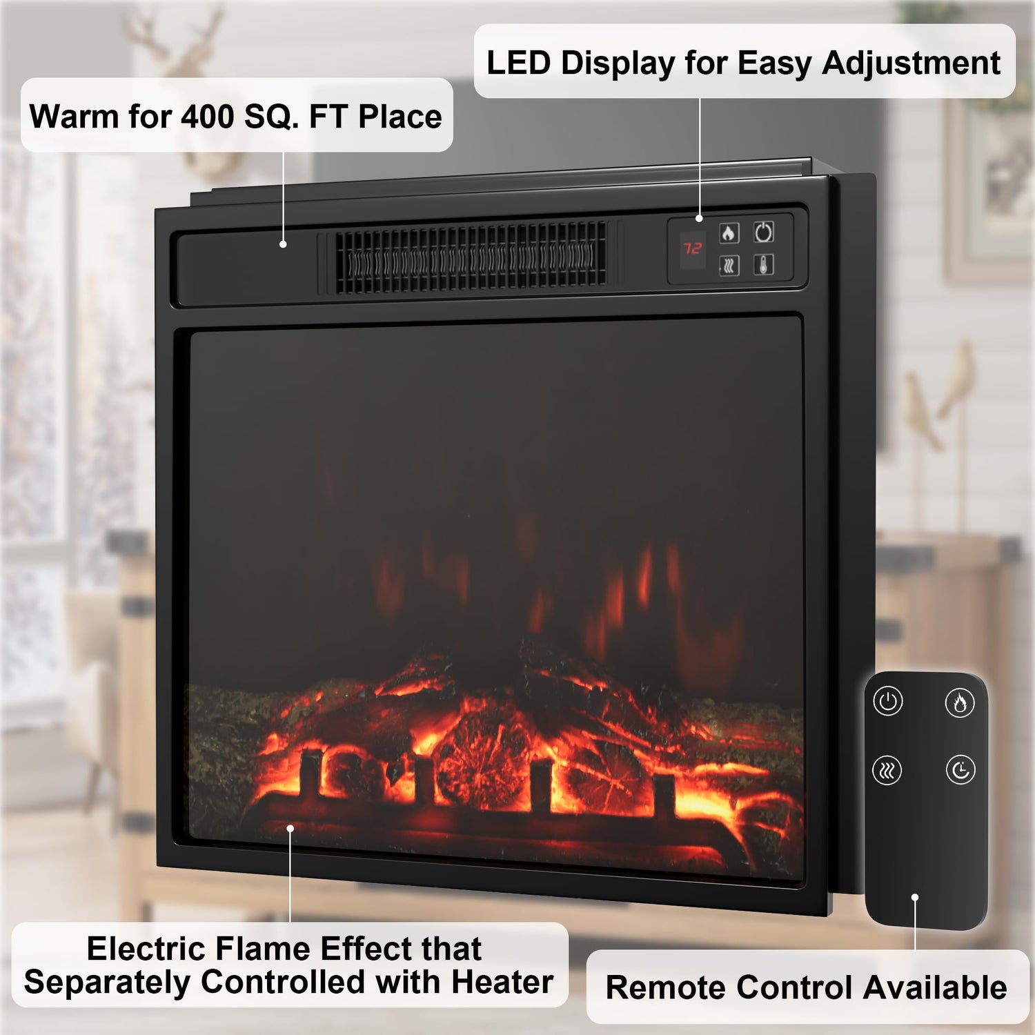 - Glass Display Fireplace: The 18 inches fireplace offers a full view of the stunning 3D electric fire effects with glass display, with 3-speed flame, 65 to 95°F heating adjustments, experience an ultimate comfort in cozy temperature, supporting warm for 400 SQ. FT. The flame and heat are separately controlled. Enjoy low noise and warm atmosphere with family.