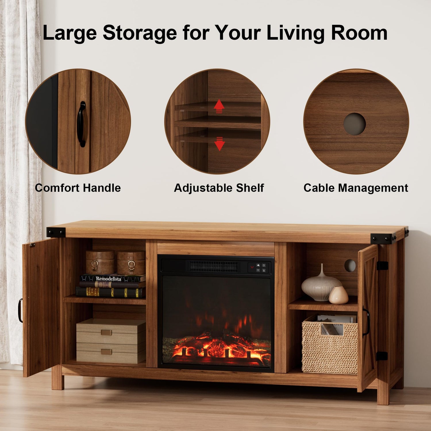 - Safe and Sturdy Quality: High-quality particle board with 5 legs on the bottom, ensuring more stability of electric apparatus. Smooth metal handles for easy accessing to your stuff in the closed cabinets. Use easy with our fireplace safety guarantee, featuring overheat protection and ETL/FCC certifications. Holds up to 220 lbs with ease.
