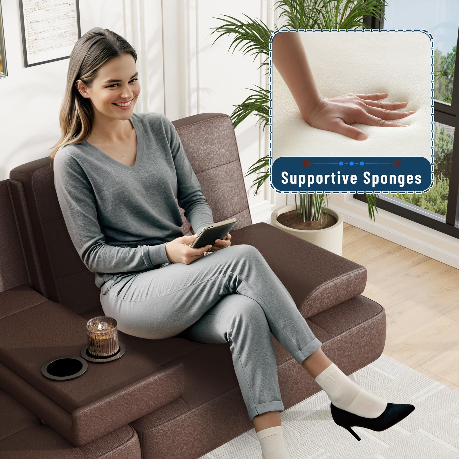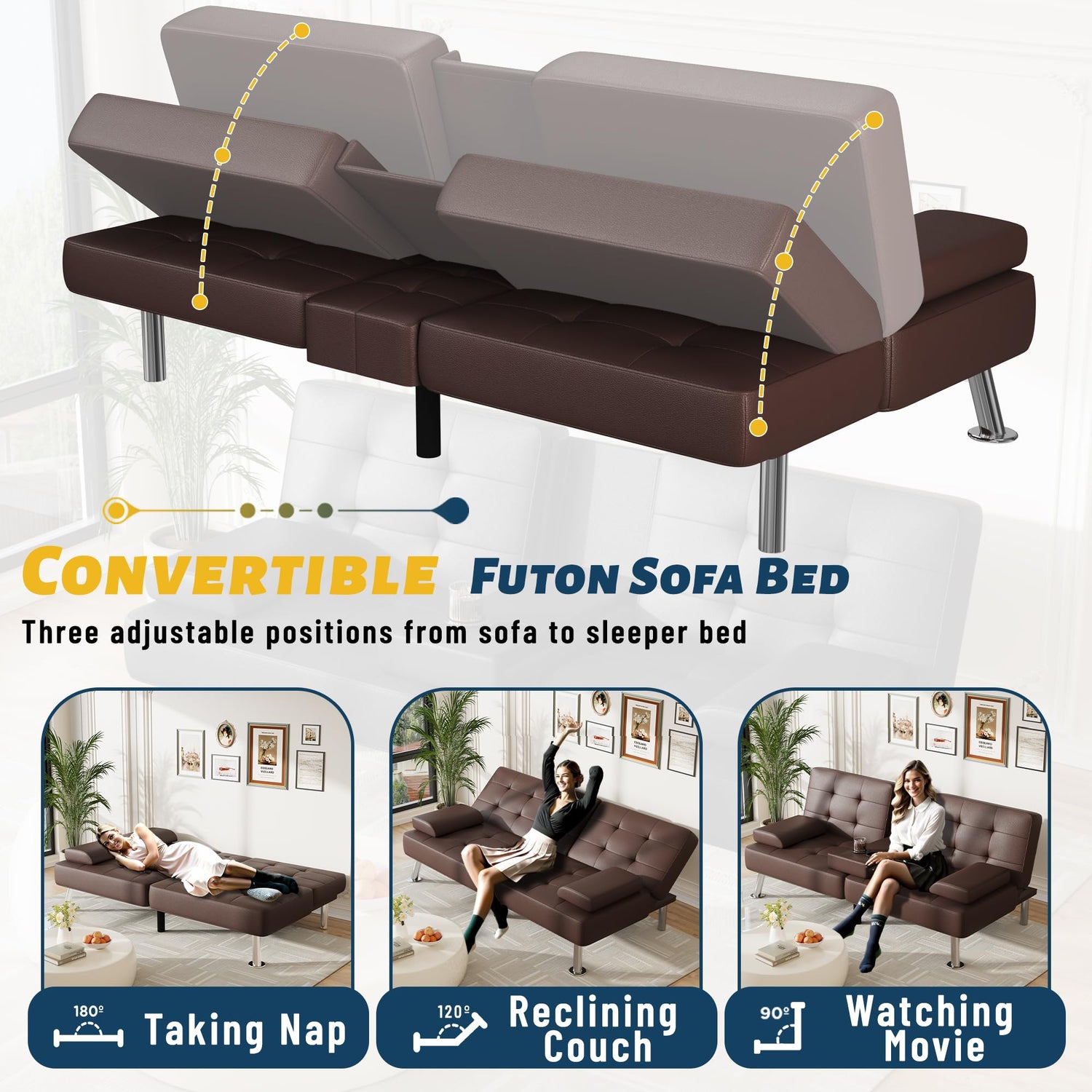 Furmax Futon Sofa Bed Adjustable Futon Couch Modern Sleeper Sofa Bed for Living Room, Business Office, Recliner Sofa with Cup Holders (PU Leather, Brown)