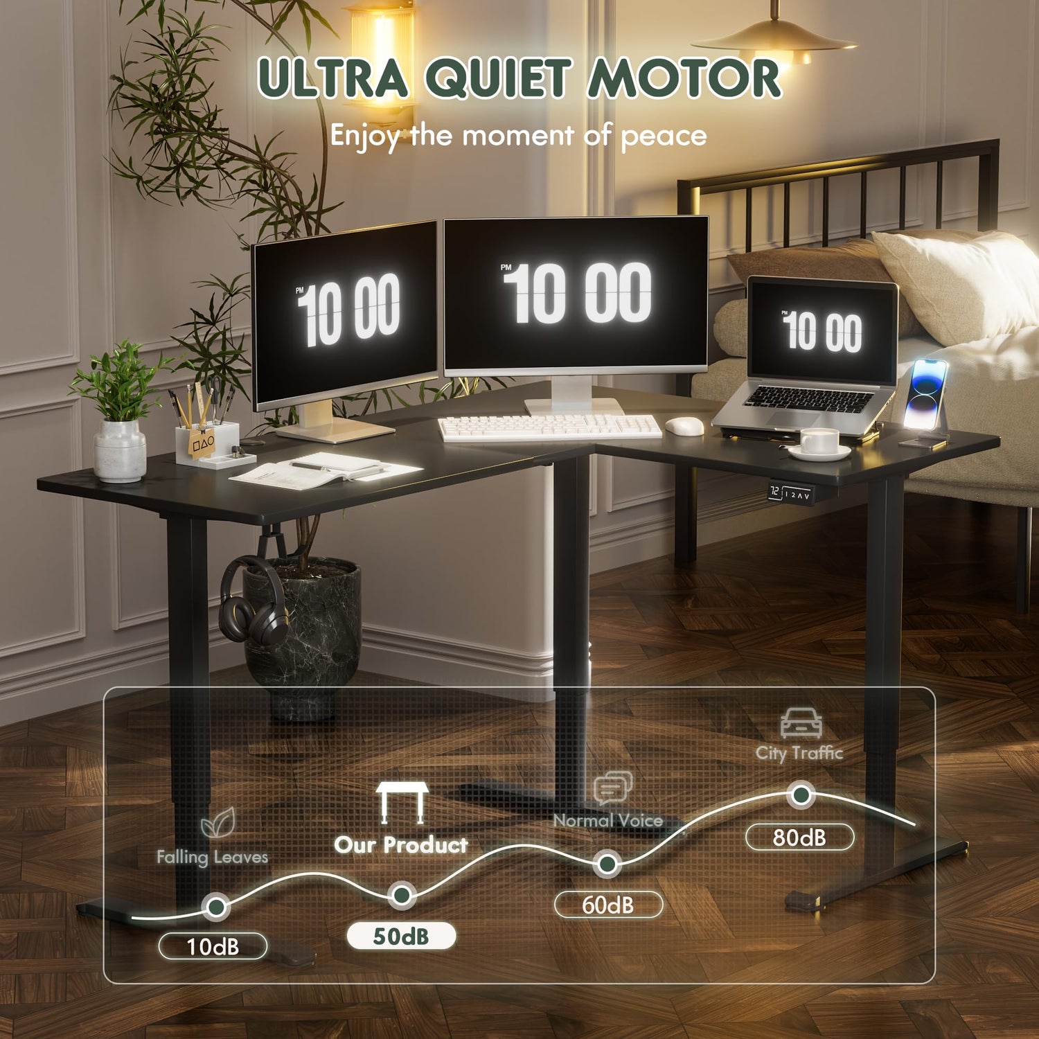 - L-shaped Standing Desk: The L shaped desktop consists of 3 parts as main and side desk, sized 63 (L) x 48 (W) x 24 (D) inches, spacious enough for multi laptops, monitors, work supplies and decors. There are headphone hook and wire holes that help make your desk more organized.