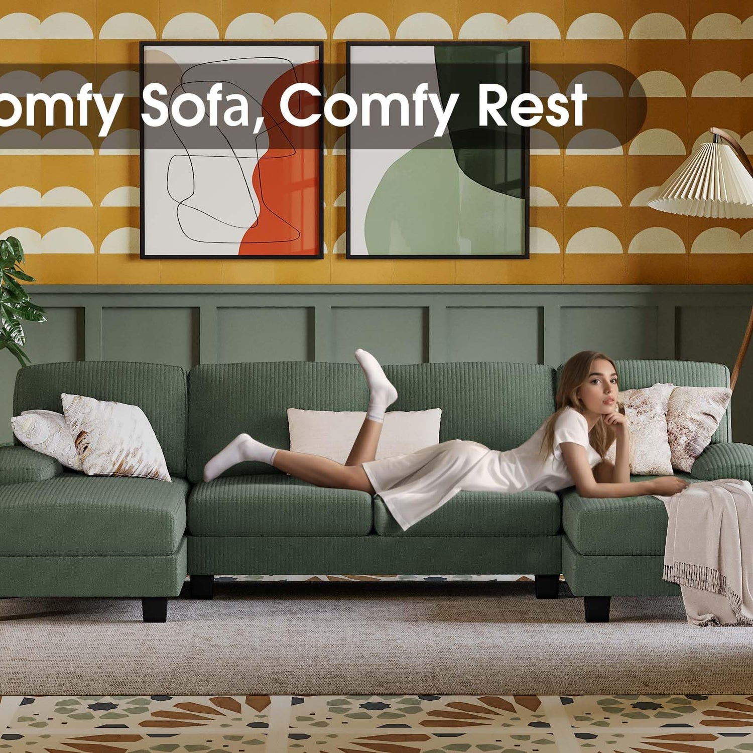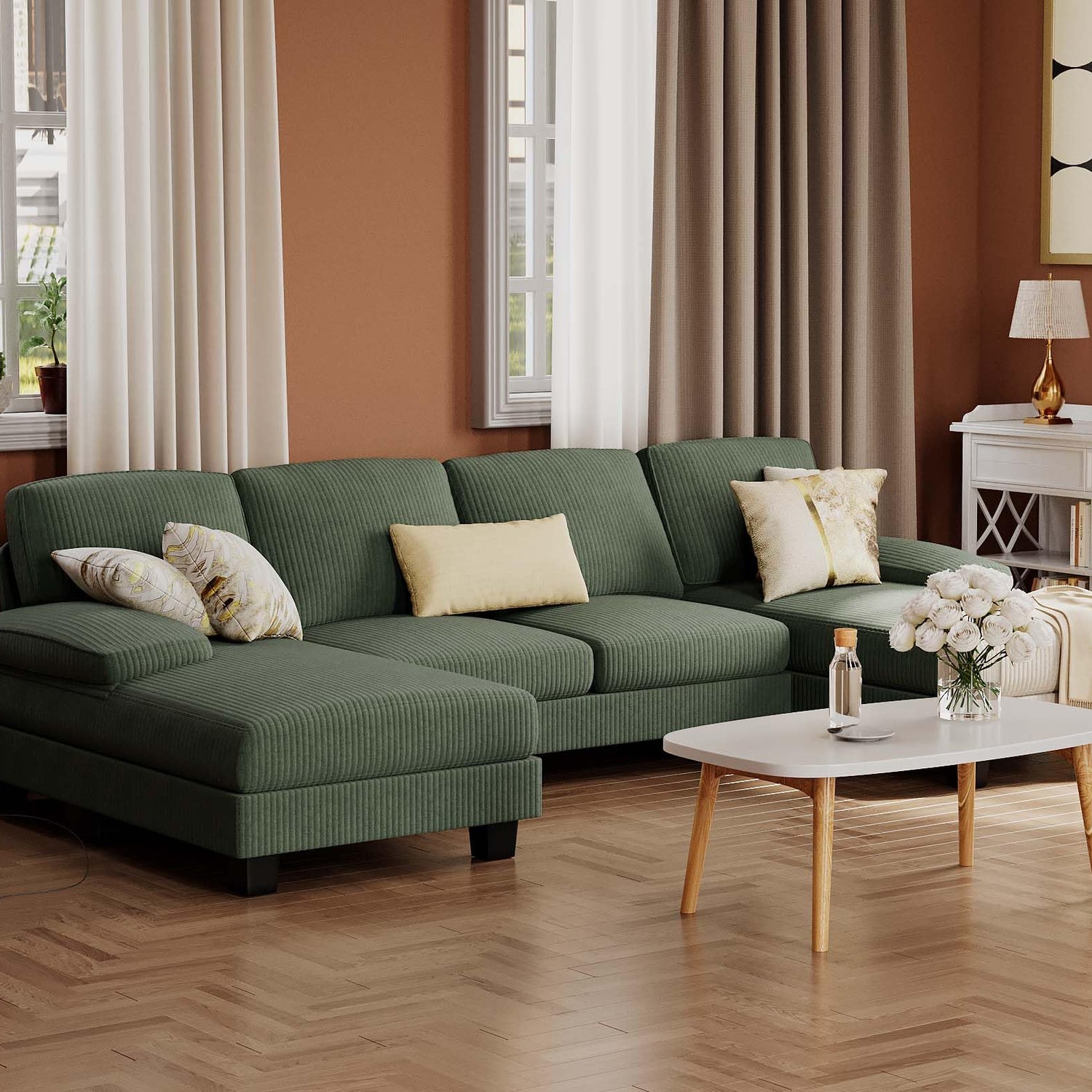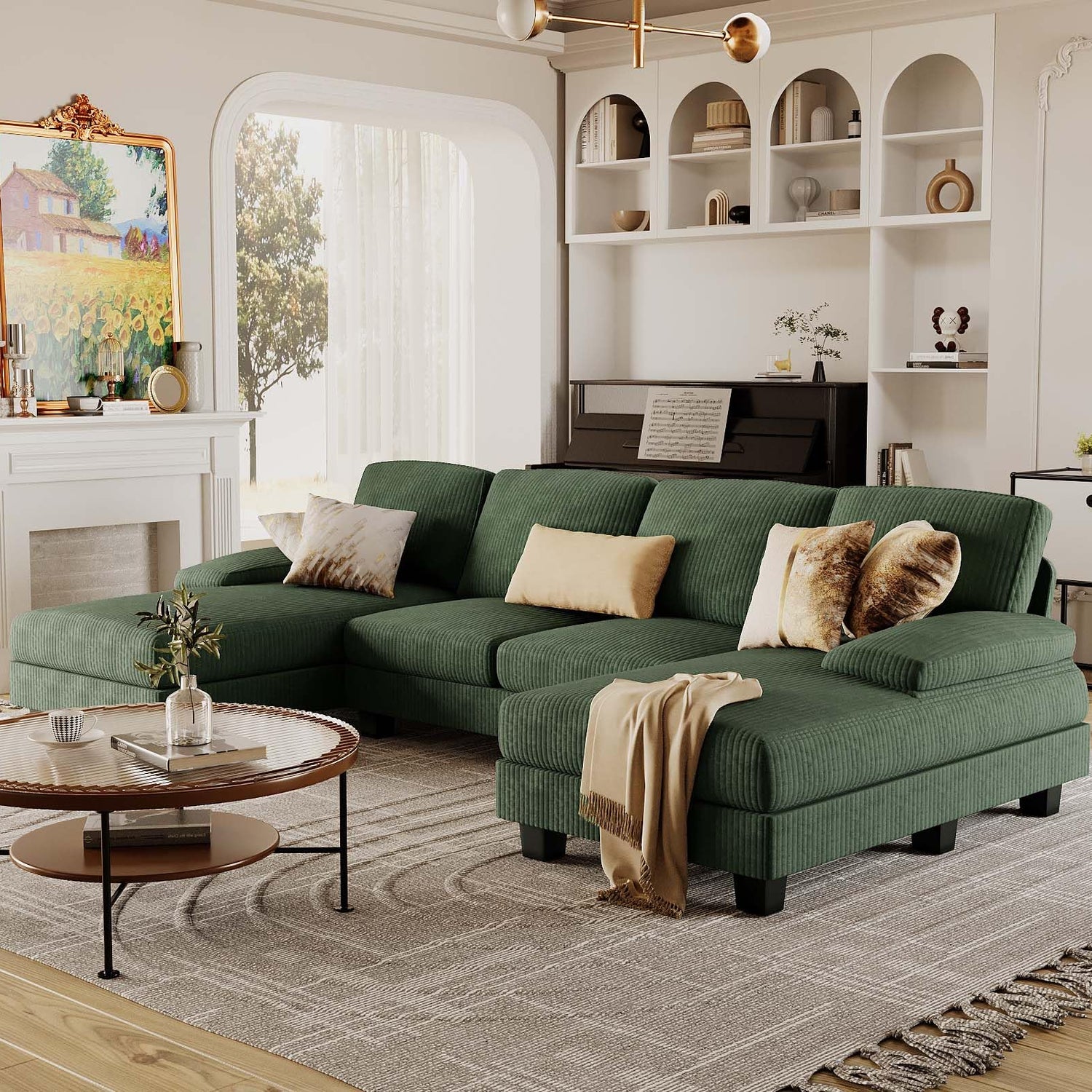 Furmax Sectional Couches for Living Room, U-Shaped Sofa Couch with Linen Fabric, 4 Seat Sofa Set with Double Chaise for Apartment (Corduroy, Dark Green)