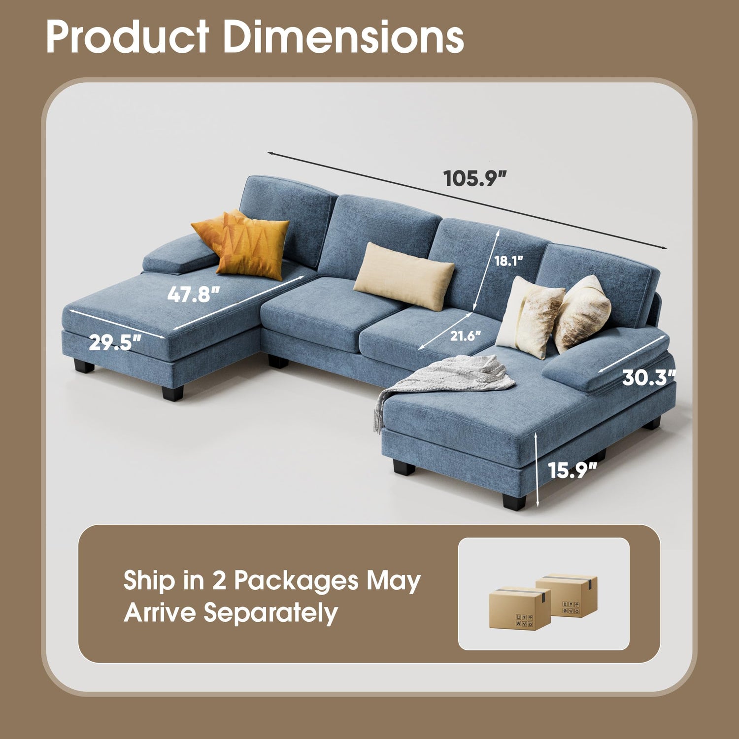 - 2 Packages: The Sectional Sofa is shipped in 2 packages, so they may be arrived separately in different time. Please be patient. And cushions are vacuum-packed, it will take 48 hours to return to its original shape.