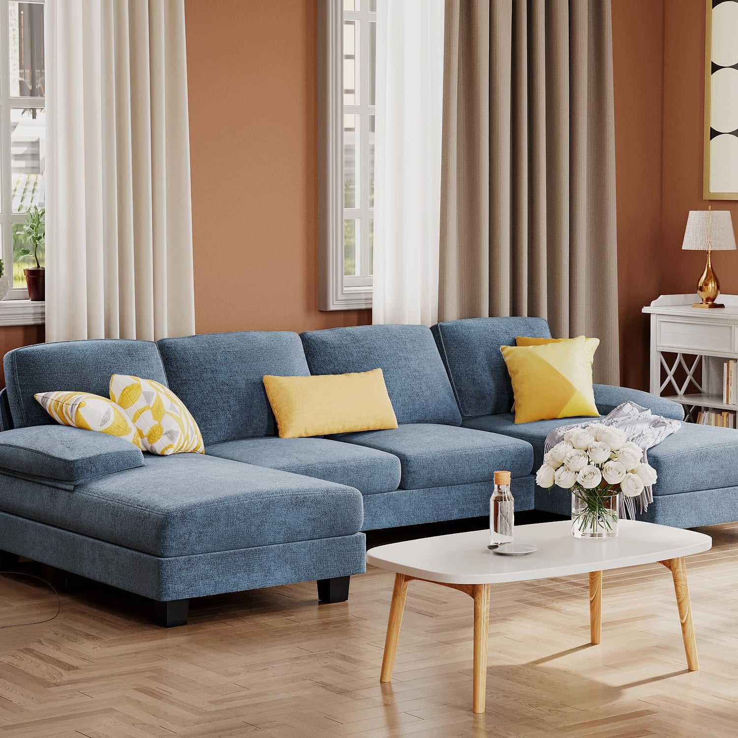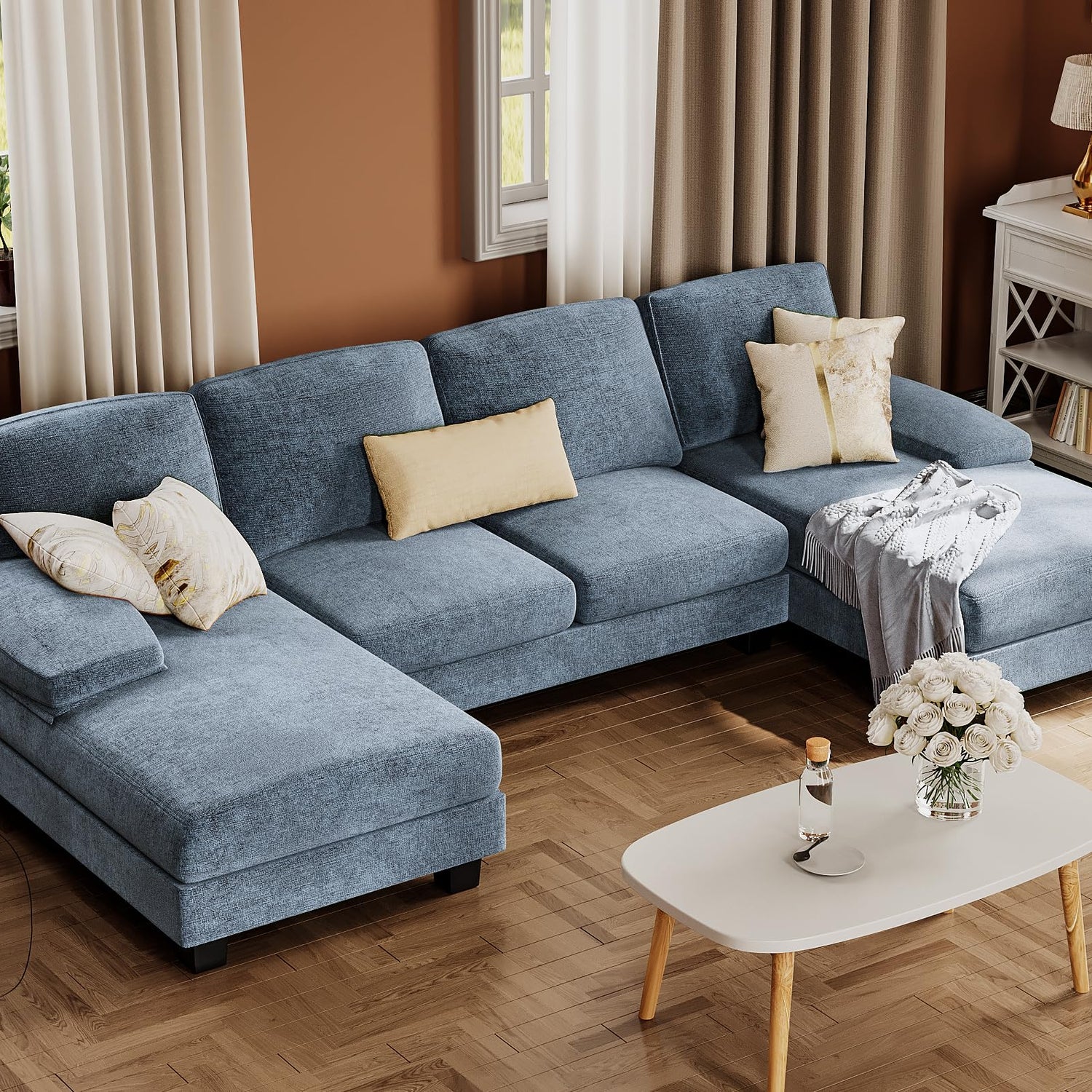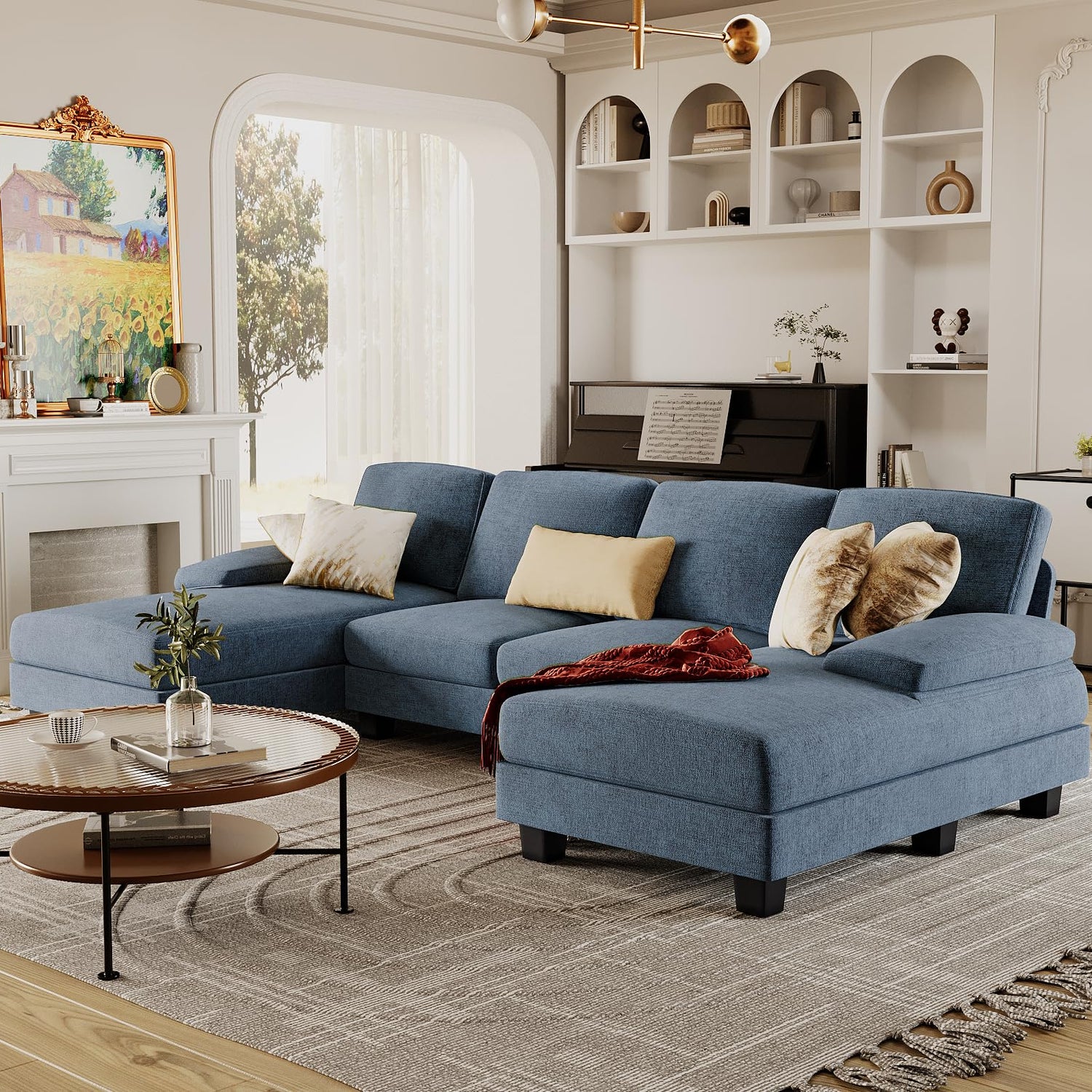 Furmax Sectional Couches for Living Room, U-Shaped Sofa Couch with Linen Fabric, 4 Seat Sofa Set with Double Chaise for Apartment (Fabric, Light Blue)