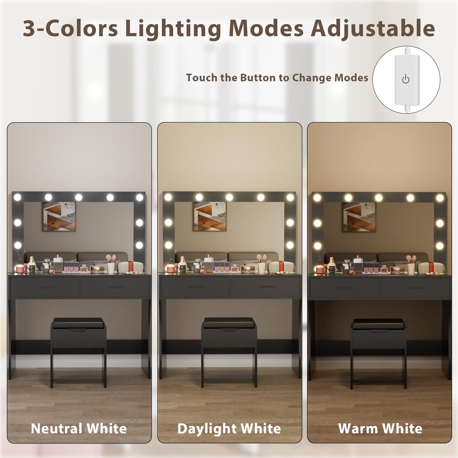 - Color and Brightness Adjustable Lights: Makeup Vanity Table comes with 11 light bulbs to provide sufficient and soft light, convenient one-button switch design, flexible and easy to switch between different lights. The brightness of the lamp is adjustable and there are 3 different color modes, warm white/ neutral white/ daylight white, so you can choose the brightness to meet the makeup needs in different light environments.