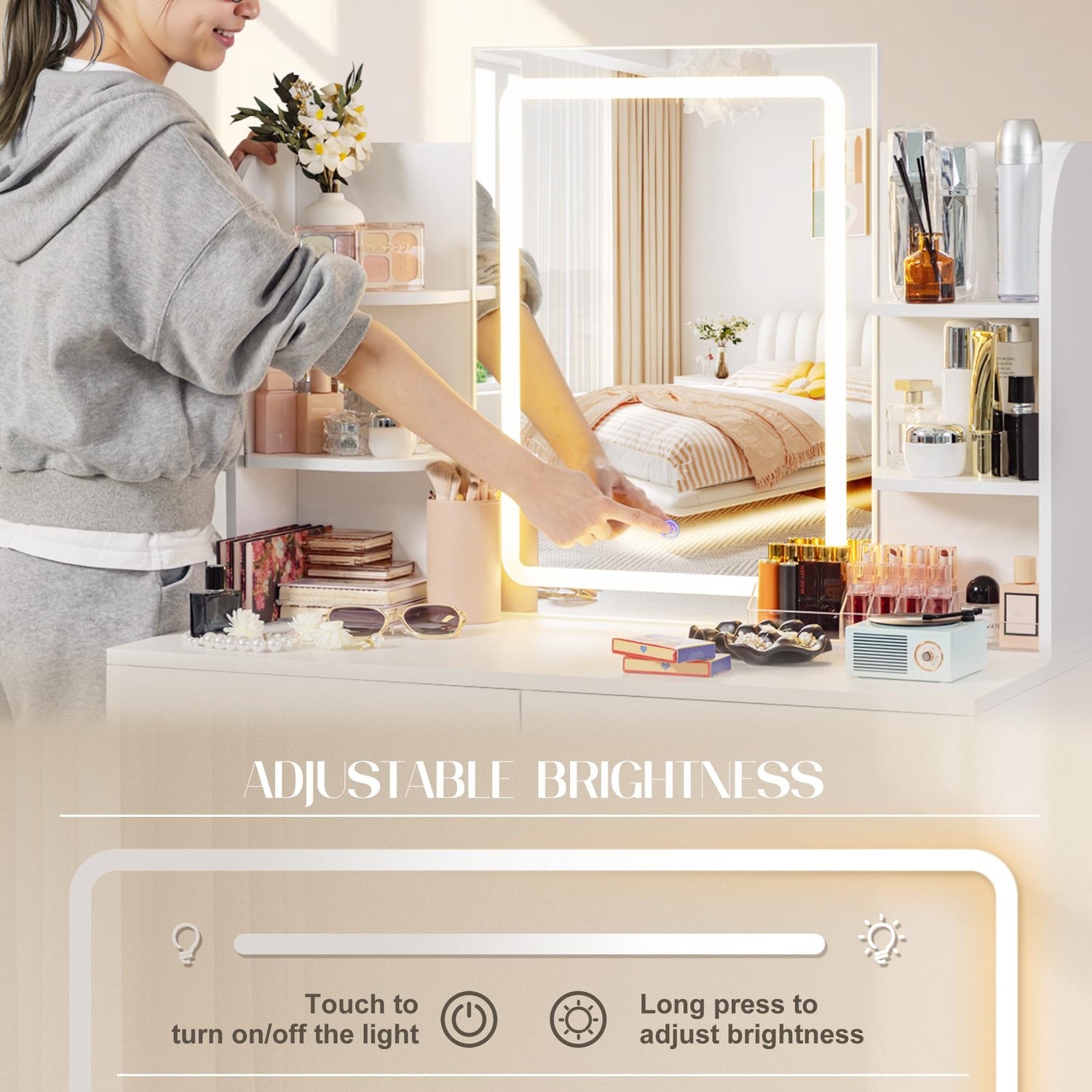 Furmax Vanity Desk with Mirror and LED Lights, Makeup Vanity Table with 3 Lighting Color, Adjustable Brightness, Vanity Table with 2 Drawers, Side Storage, for Bedroom (White, with Bench)