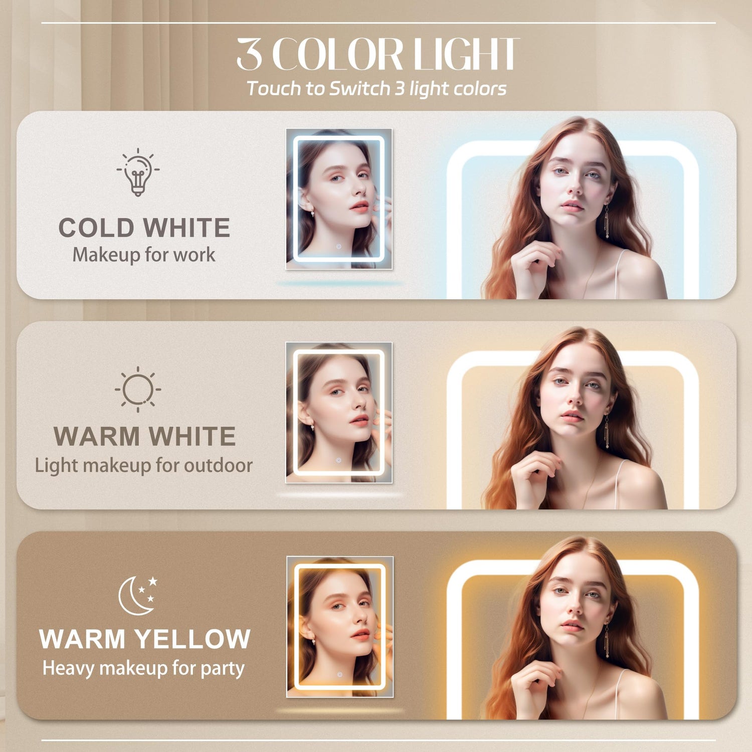- Bright and Adjustable Makeup Mirror: The vanity Mirror surrounded by LED light strip. You can touch the switch to change 3 light colors (cold white, warm white, and warm yellow), or long press to adjust brightness. This personalized lighting can meet the makeup needs for multiple occasions as well as create different atmospheres for various moods