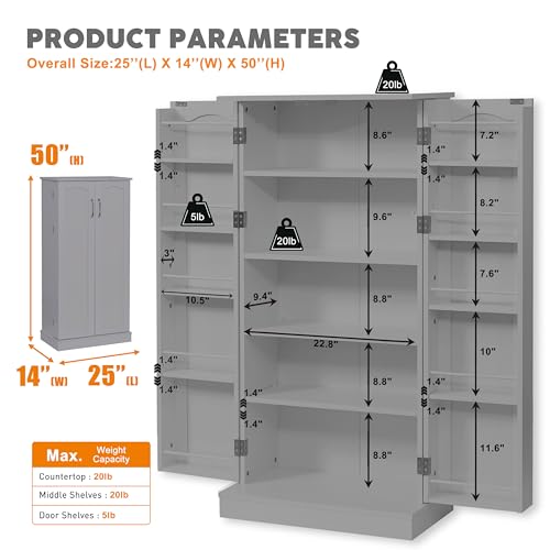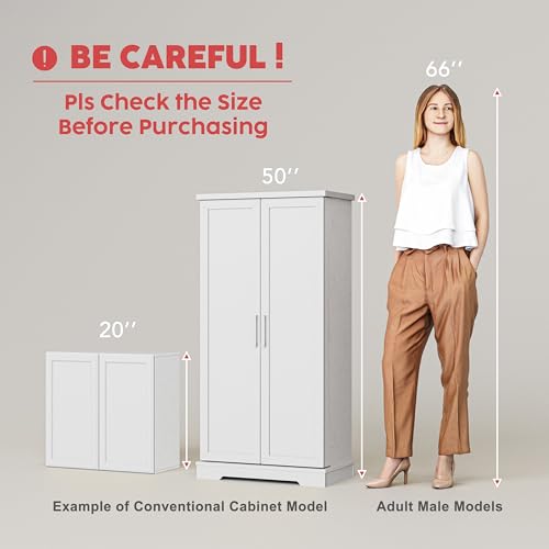 - 【Ample Storage for Small Space】Say goodbye to clutter and hello to organization with our cute white kitchen pantry cabinet. With a height of 50", it's 9" taller than other 40" pantry cabinets on the market, providing an entire layer of storage space. DIM of 25"W x 14"D x 50"H, it's perfect for small kitchens, living rooms, and apartments that are tight on space