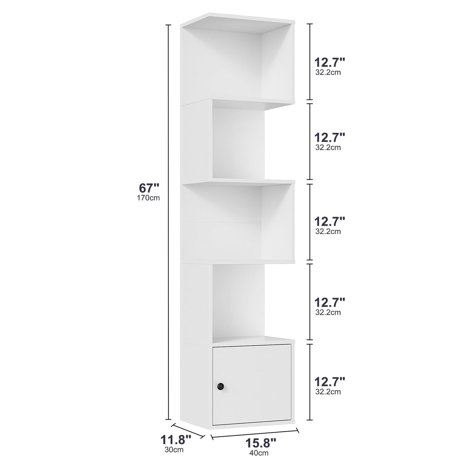 Furnify 5 Tier Bookshelf, 67" Tall S Shaped Bookcase with Door, Modern Open Book Shelf Standing Unit, Room Divider, Freestanding Wood Display Shelf for Living Room, Office, White