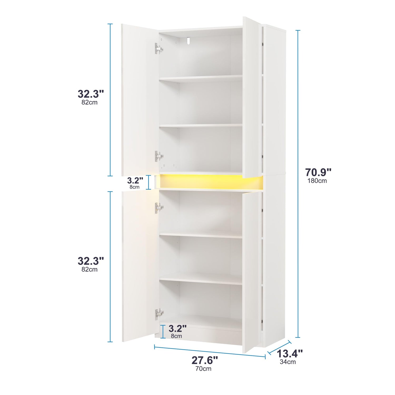 - 【Ample Storage & Adjustable Shelves】- The pantry features both the upper and lower cabinet with 2 adjustable shelves, which allow you to adjust the height in 3 levels to meet your individual needs. Pantry cabinets are perfect to store living goods, small appliances, cookware, and a variety of kitchen supplies. With its dimensions measuring 27.6"W x 13.4"D x 70.9"H