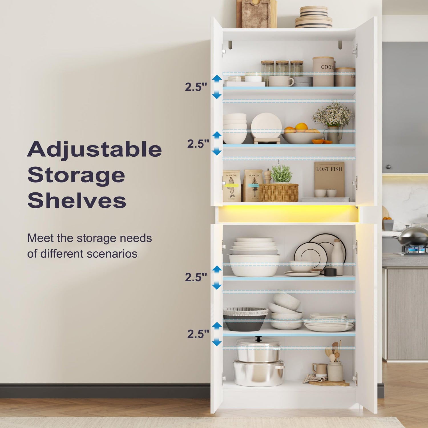 - 【LED Lights Pantry Cabinet】- This kitchen cabinet features 4 high-gloss doors and includes an advanced adjustable LED lighting system—complete with integrated light strips. With customizable colors and multiple dynamic modes, you can effortlessly set the perfect mood for any occasion, whether it's an intimate dinner, a lively gathering, or a relaxing evening. Control the ambiance with ease using the included remote or a convenient smartphone app, transforming your kitchen or dining space into an immersive experience. More than just storage, this cabinet elevates your home with modern functionality and stylish versatility