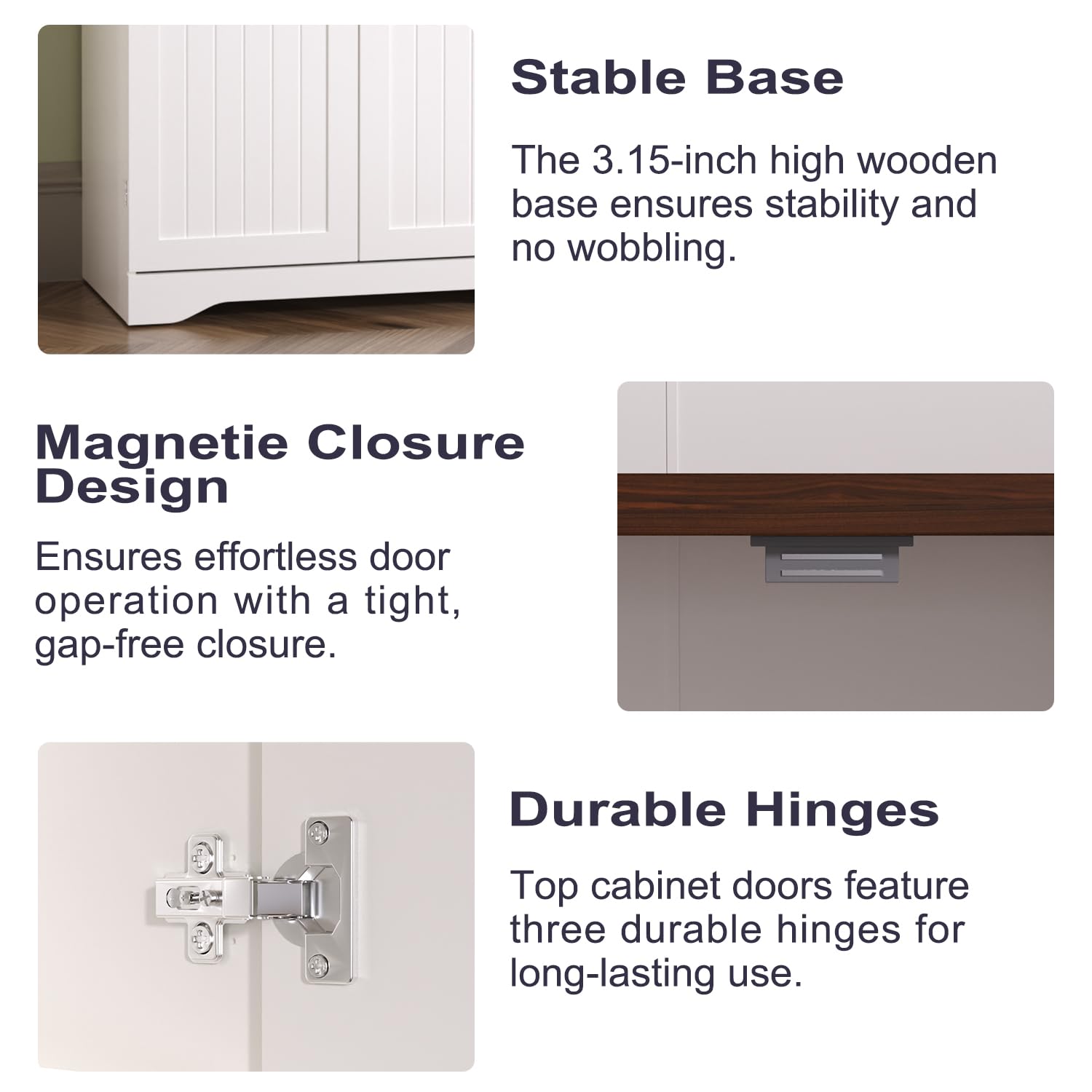 - 【Adjustable Shelves】- This freestanding cupboard is designed to perfectly adapt to your storage needs, featuring 4 adjustable shelves that can be customized to 3 different height levels. Whether you need to store tall bottles, bulky kitchen appliances, or smaller items, the flexible design ensures optimal space utilization. The easy-to-adjust shelves make it simple to reorganize your storage as your needs change, offering both functionality and convenience