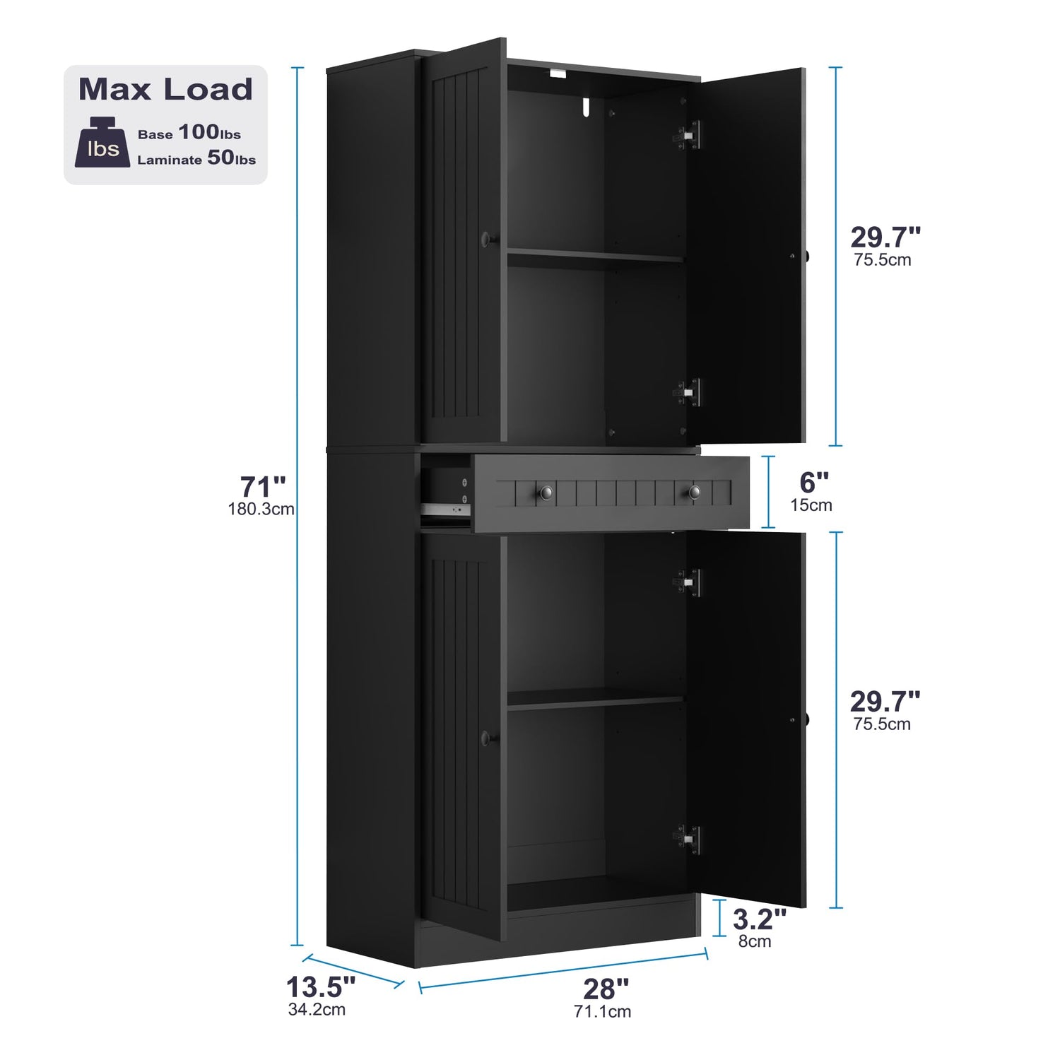 Furnify Kitchen Pantry Storage Cabinet, 71" H Farmhouse Pantry Cabinet with 4 Doors & Drawer, Freestanding Cupboard with Adjustable Shelves, Rustic Wood Cupboard for Kitchen, Dining Room, Black