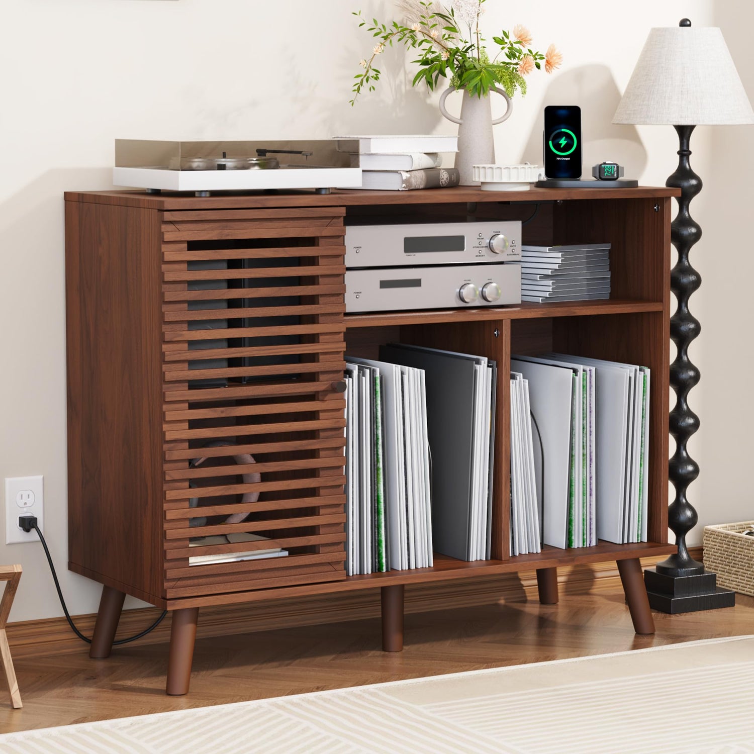 Furnify Record Player Stand with Charging Station, Mid-Century Turntable Stand with Slatted Doors, 40" W Record Player Table Holds Up to 350 Albums Vinyl Storage Display Shelf for Living Room, Walnut