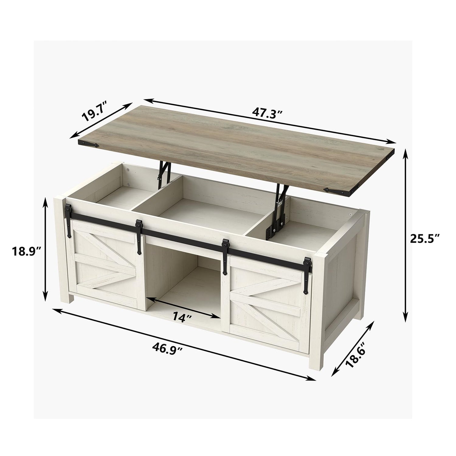 Furnihold 47.3''Lift Top Coffee Table, Farmhouse Center Table with Large Storage & Sliding Barn Doors, Modern Rectangular White Cocktail Table for Living Room, Grey Top