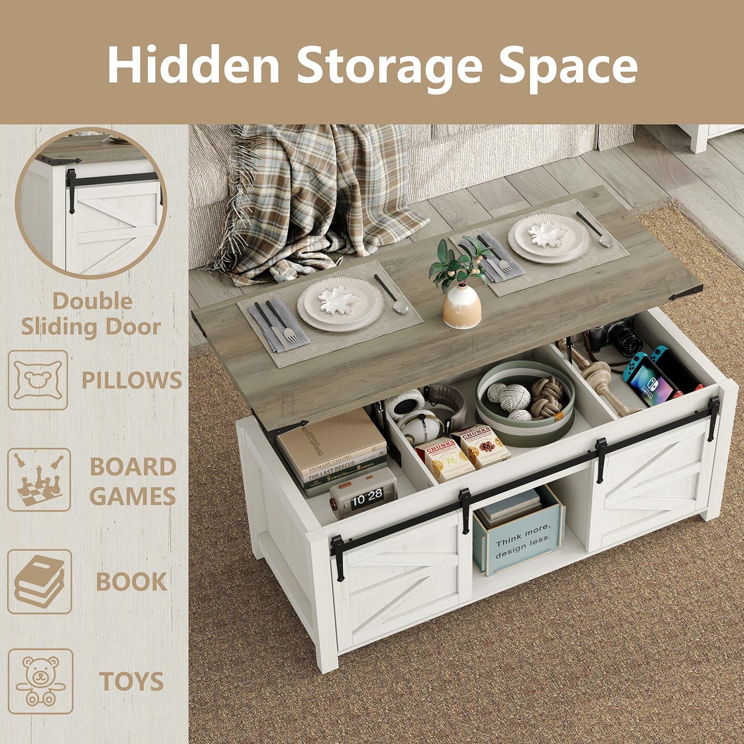 - Large Storage : This farmhouse coffee table features multiple storage areas, have a spacious hidden space underneath. The two side cabinets and middle open storage space, by sliding the barn doors, you can customize storage space