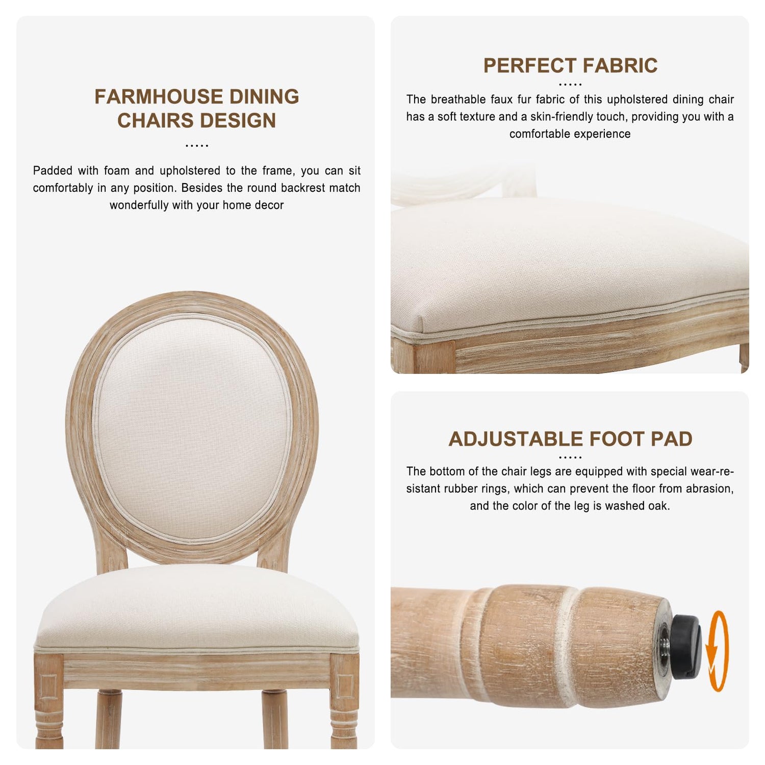 - Farmhouse Dining Chairs Design: French dining chairs set of 4, with upholstered chair seats and wooden frames, provide you with unparalleled comfort of french country leisure. Padded with foam and upholstered to the frame, you can sit comfortably in any position. Besides the round backrest match wonderfully with your home decor.