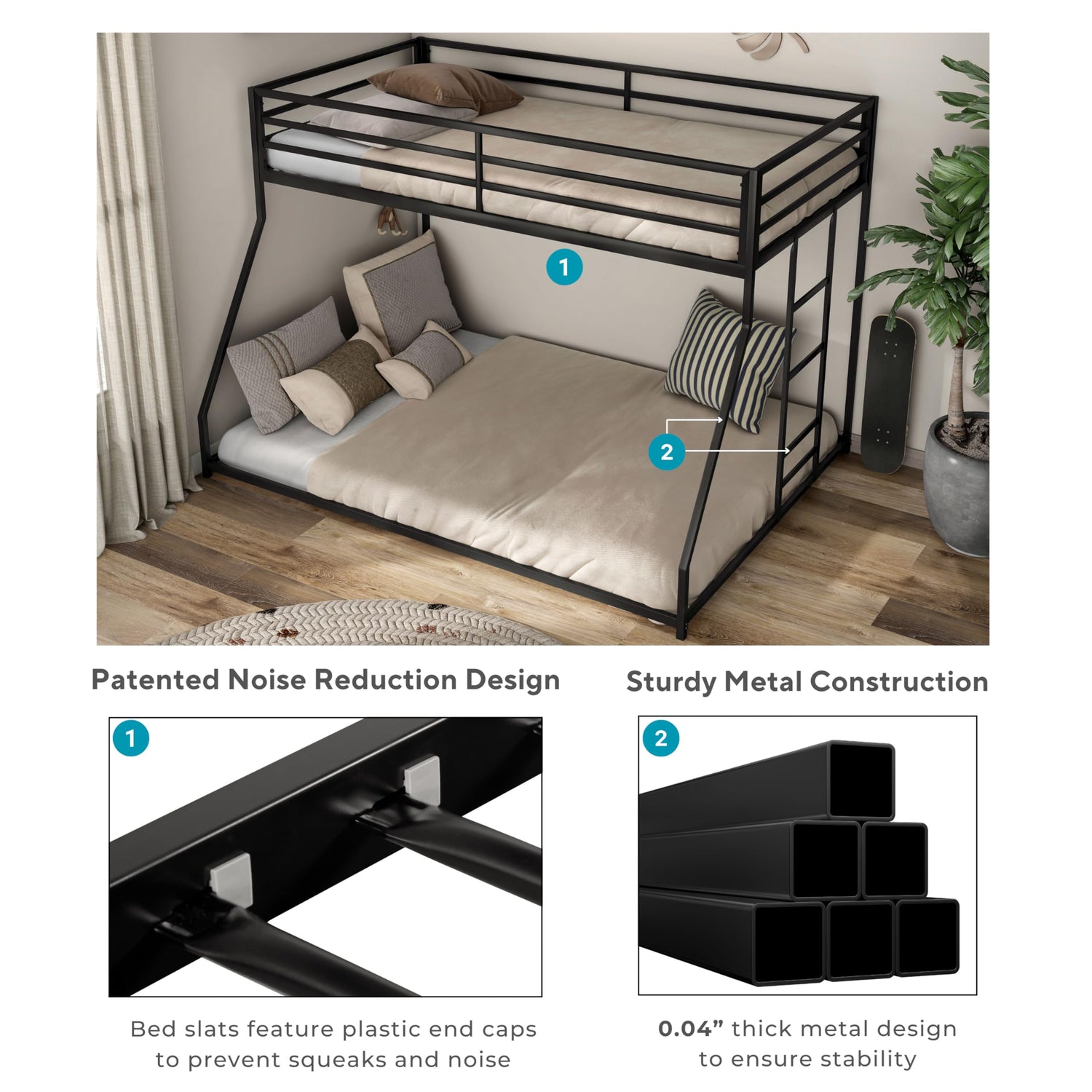 Furniture of America Dravenor Modern Metal Twin Over Full Low Profile Bunk Bed with Reversible Ladder and Twnty-Two Slats, No Box Spring Required, for Kids, Bedroom, Dorm, Black