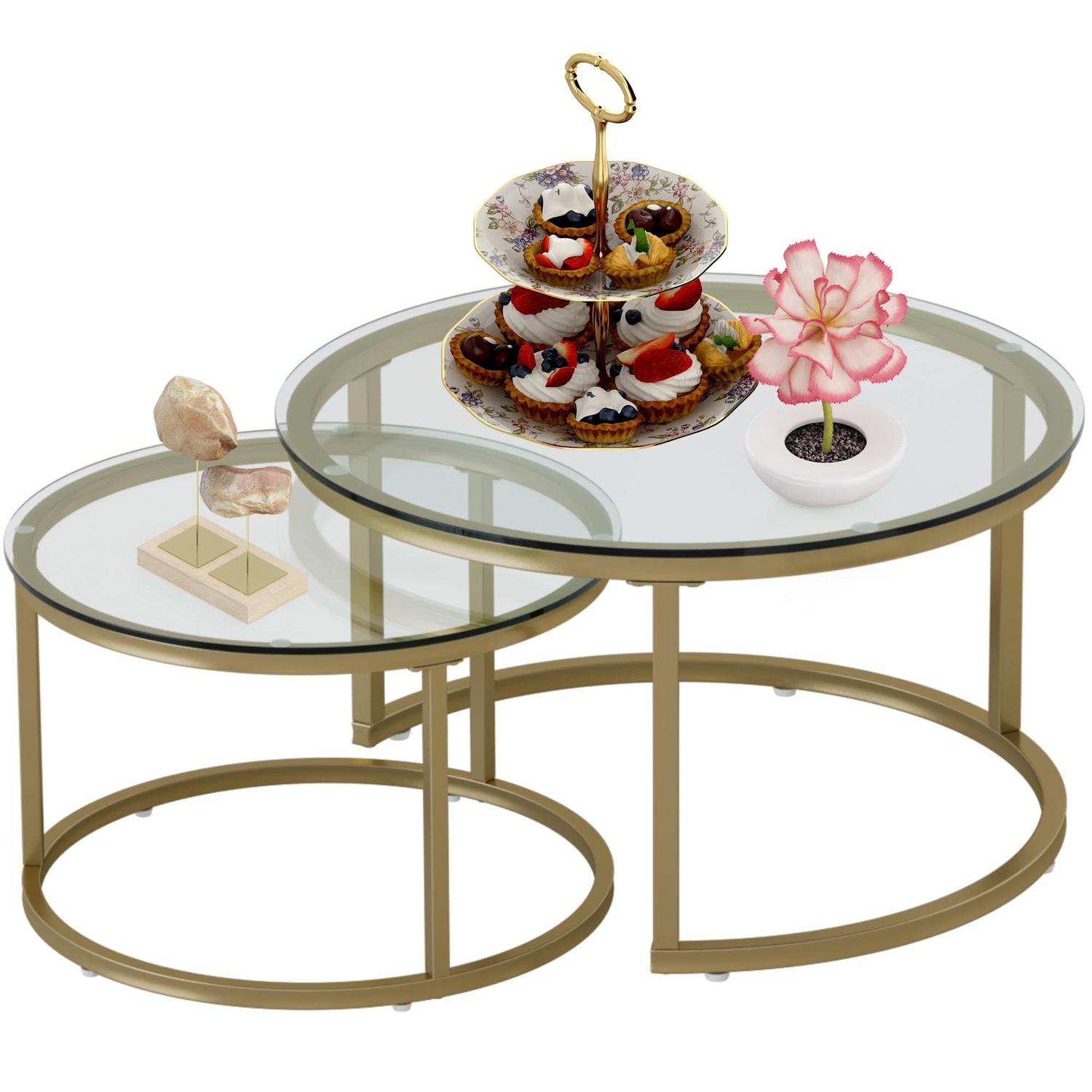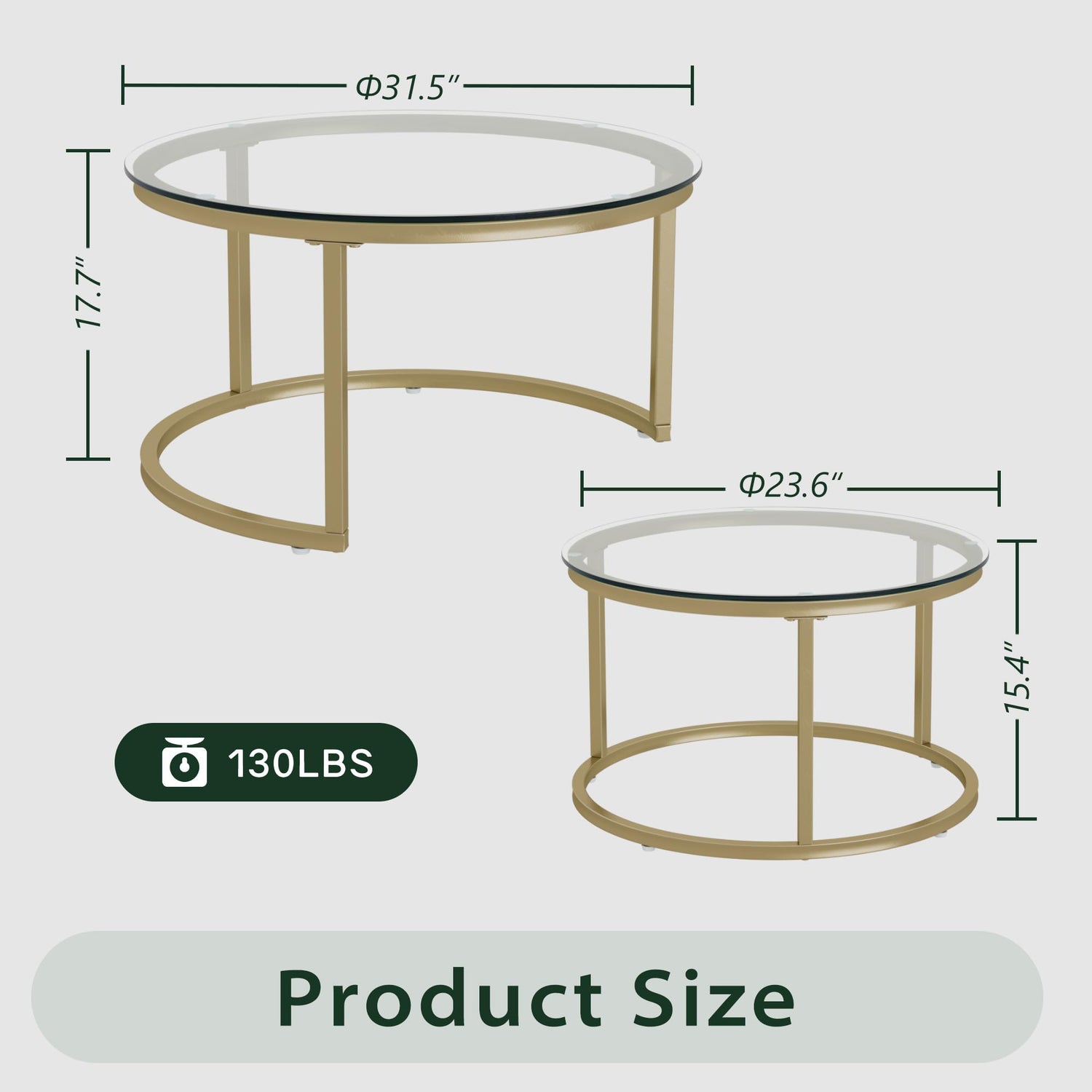 Furnivado 31.5" Nesting Coffee Table Set of 2, Round Nesting Coffee Tables with Tempered Glass Top, End Tables with Metal Frame for Living Room, Bedroom, Transparent Glass