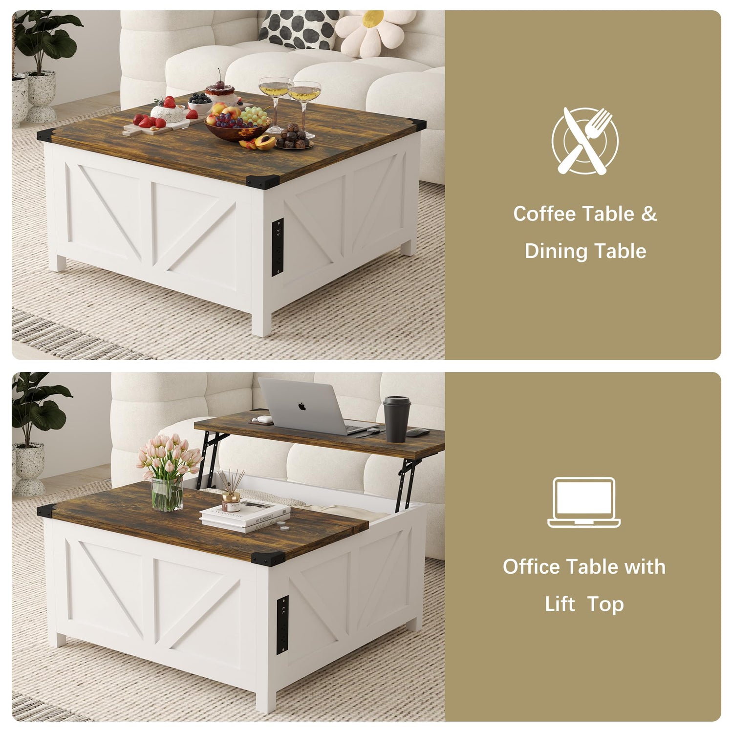 - Ingenious Lift-Top Design: This white coffee table is a multifunctional wonder, its lift-up surface easily converts it into a desk, and when closed it can be used as a coffee table or dining table when you are entertaining guests. With a built-in charging station, you can keep your gadgets juiced up while you work, play, or relax—no more hunting for outlets!