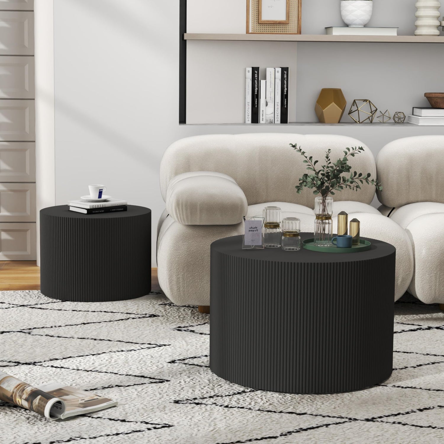 Furnivado Black Round Coffee Table Set of 2, Modern Wooden Nesting Coffee Tables for Living Room, No Assembly Required Circle Side Tables Set Accent End Table for Bedroom, Balcony