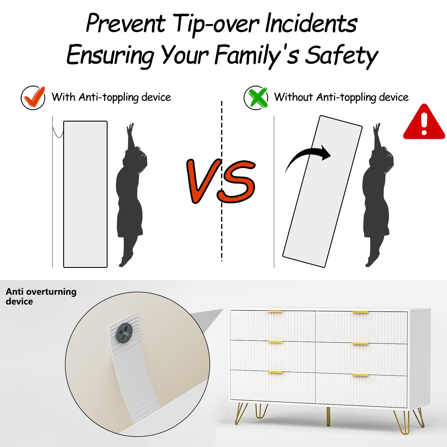 • Quality Materials: This wood dresser is made of high-quality MDF and sturdy metal elements. CARB P2 certified material ensures eco-friendly to your family. The kids dresser is equipped with two Anti-Tipping devices to avoid potential safety hazards to children or your pets.