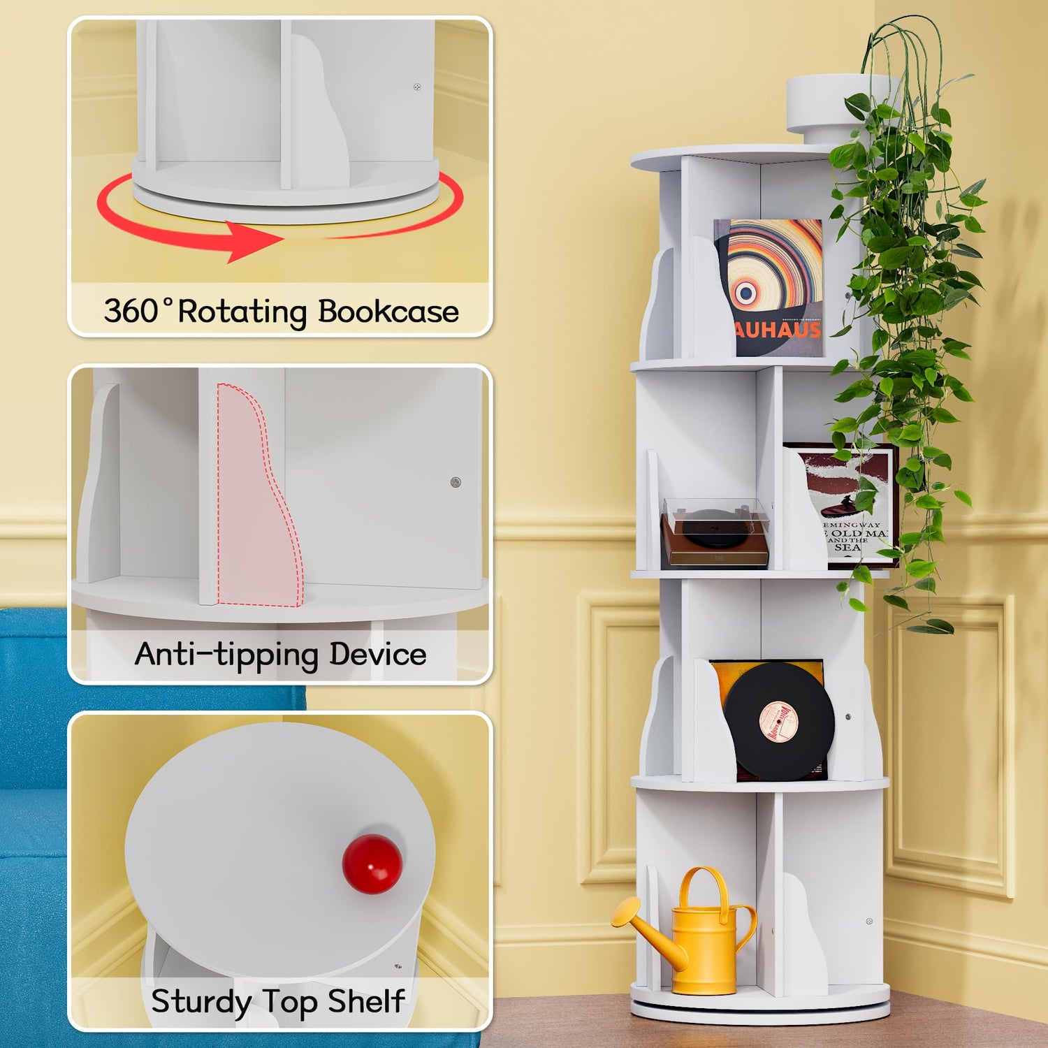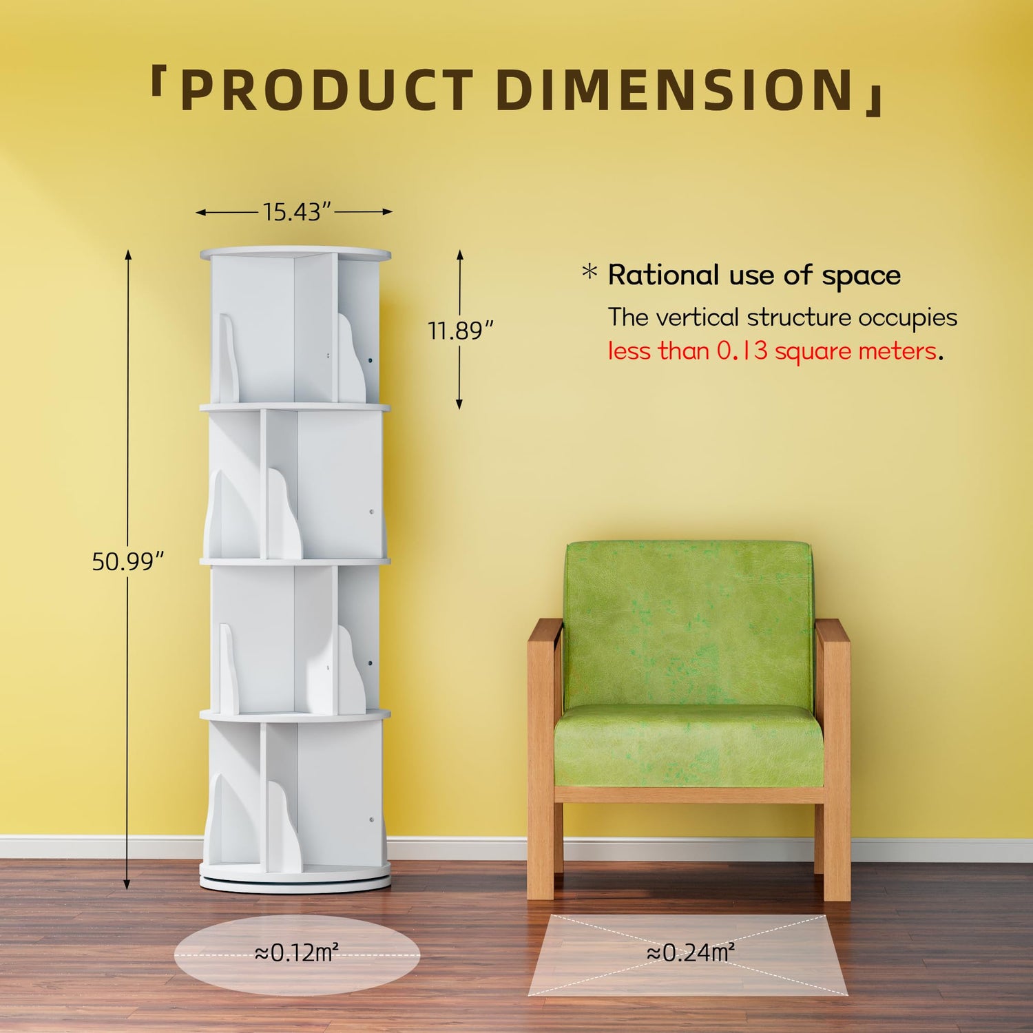 - 360° ROTATING BOOKSHELF: The rotating bookcase is equipped with smooth Steel ball-bearing turntable, easy and non-jamming to use. Just gently rotate it to get the books you want. Each shelf is equipped with 4 baffle to ensure that the bookshelf will not fall.