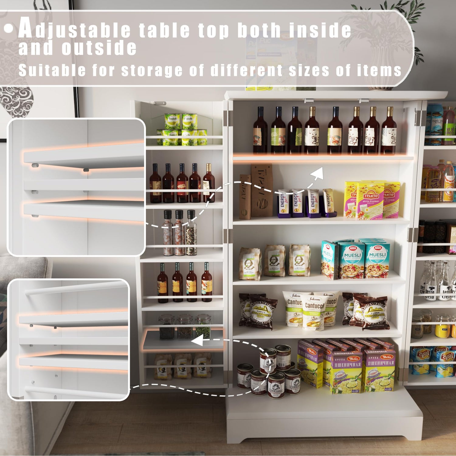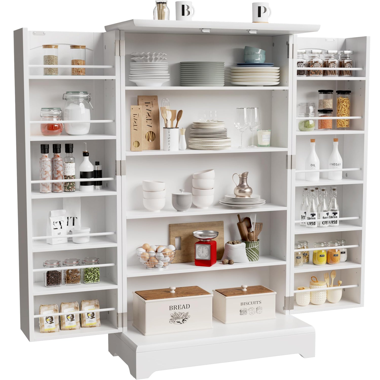 - Universal Design: With 14 height-adjustable shelves, the storage cabinet allows users to personalize the space for different sized kitchen items such as dishes, utensils, spice bottles and snacks. Convenient knobs, magnetic door locks and select metal hinges make opening and closing the cabinet doors easy.