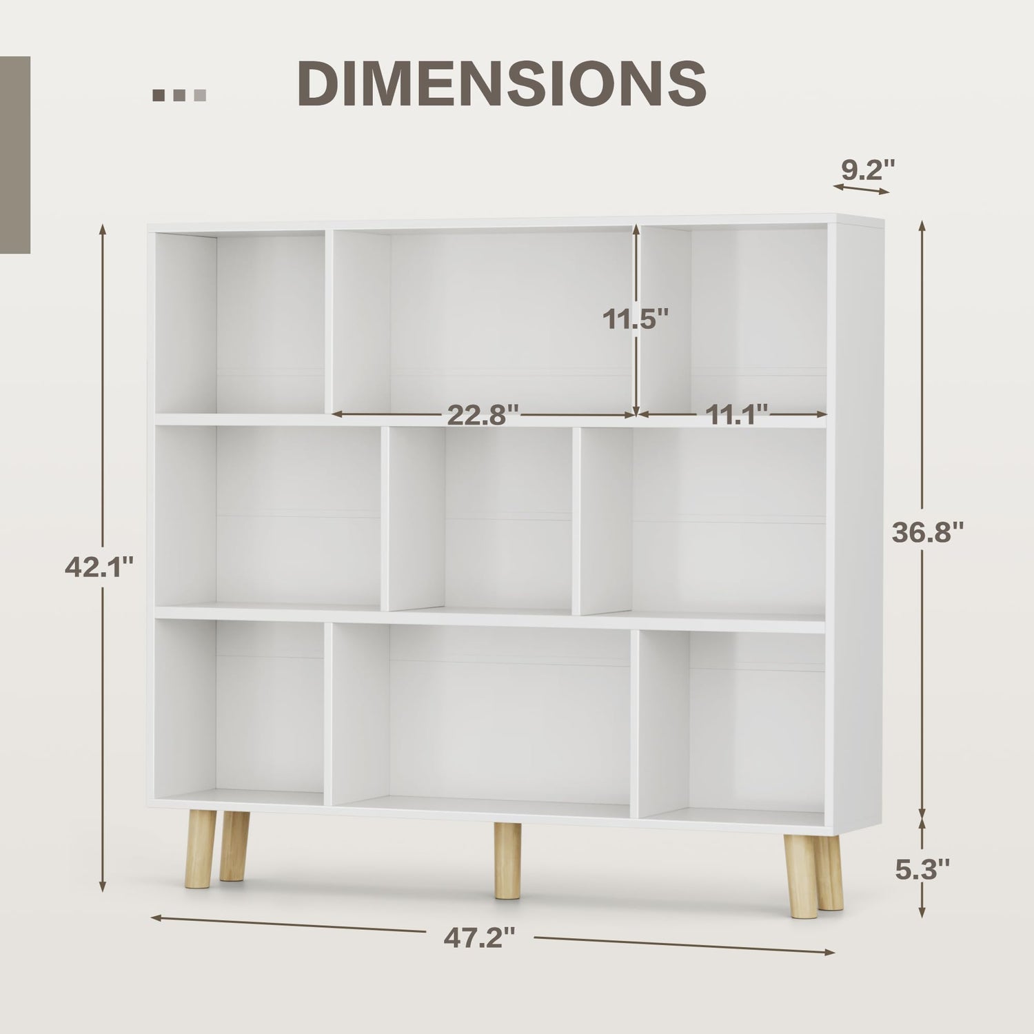 - 9 Cubes Bookcase: Our open frame storage bookshelf features 9 spacious storage cubes, perfect for storing books, potted plants, photo frames, sculptural ornaments and more. The large compartment measures (22.8" W*11.5" H*9.2" D) and the small compartment measures (11.1" W*11.5" H*9.2" D), which can meet your different storage needs.