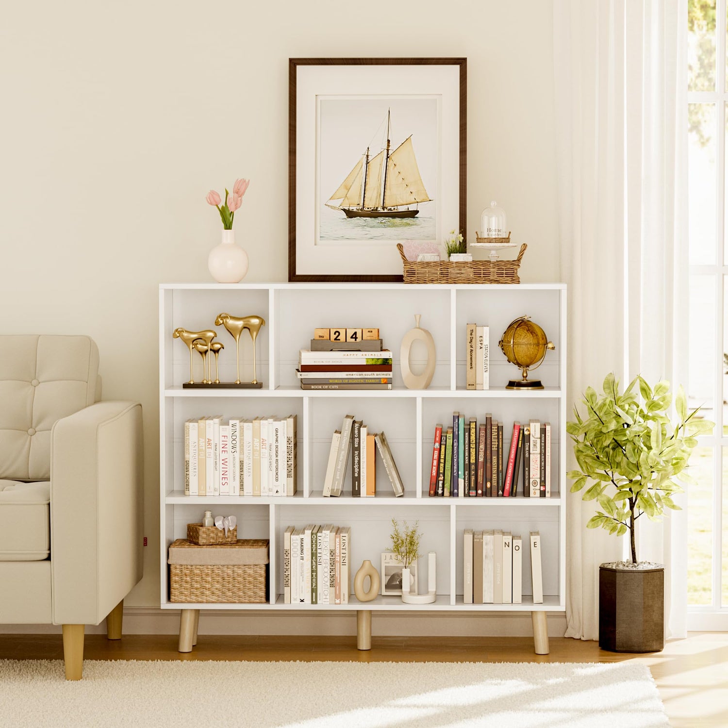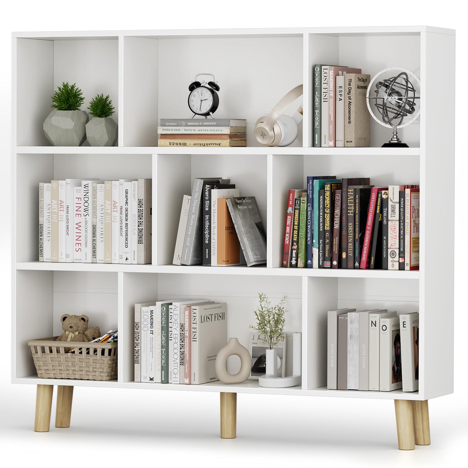 Furniwell 9 Cube Bookcase & Bookshelf, 3 Tier Storage Organizer with Legs, Freestanding Open Frame Book Shelves for Living Room, Office, White