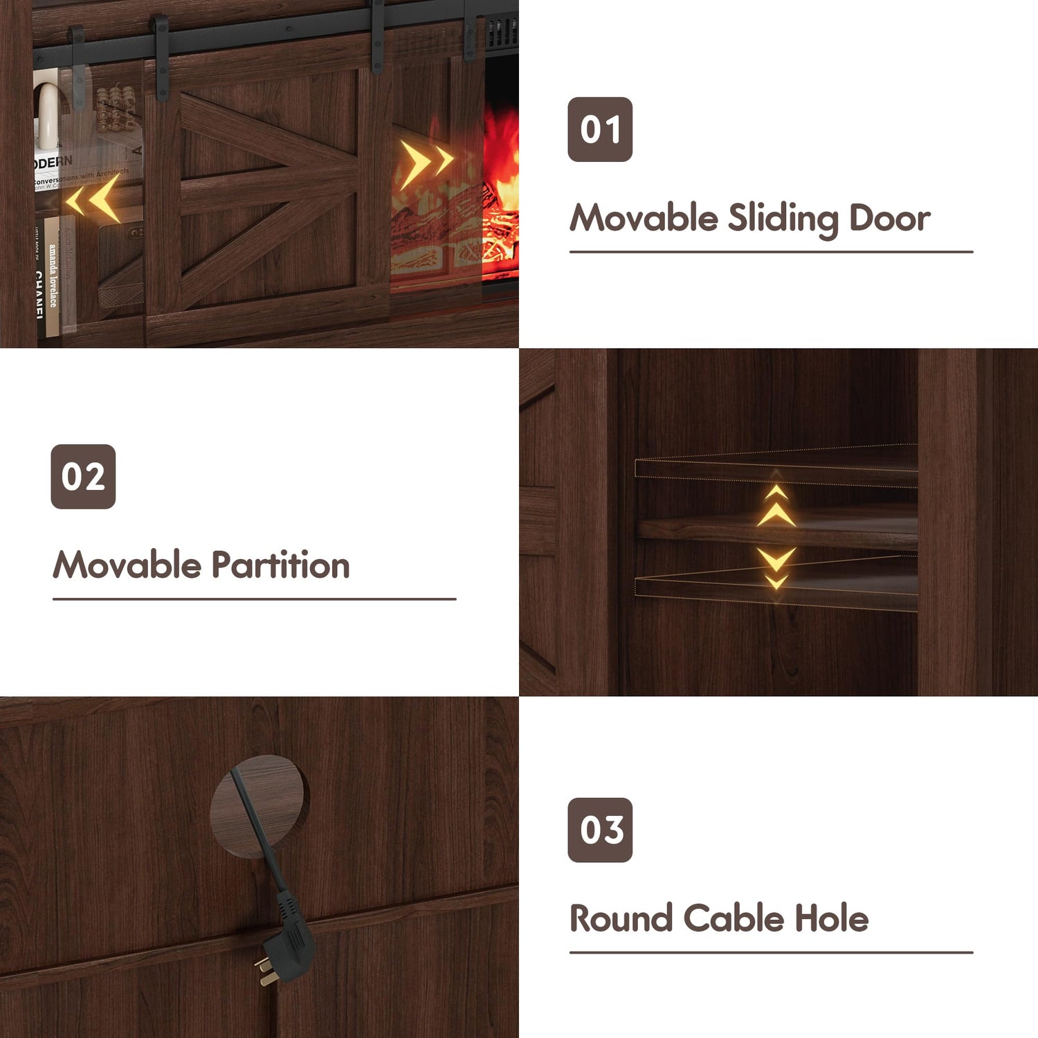 - CLASSIC STYLE: This fireplace TV stand features 2 sliding barn doors and industrial style matte black metal hardware. Easy access to cabinets and shelves via metal slides that glide smoothly and quietly. The rustic farmhouse charm of this farmhouse TV stand with fireplace makes it the perfect place for a home entertainment center.