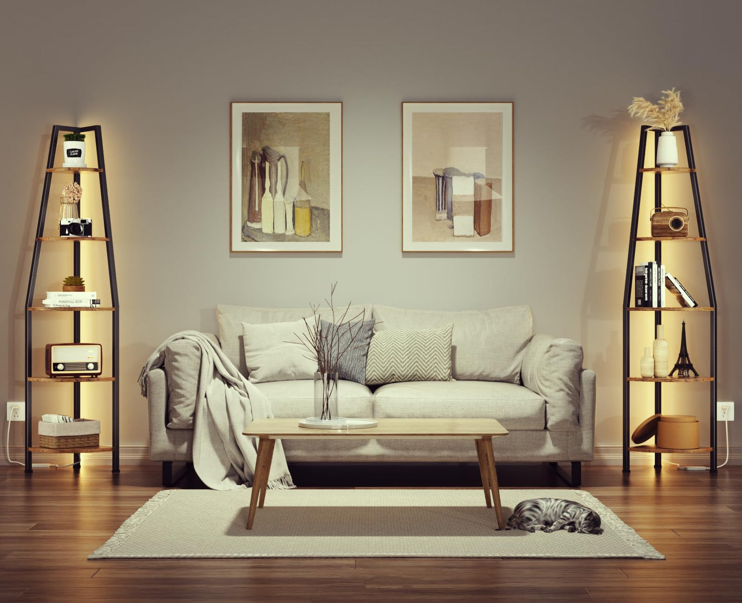 - Switch Multiple Light Colors Freely : This shelf is equipped with LED light strip, the light can be controlled button or mobile phones. You can freely switch the brightness, color, flashing mode, and frequency of the lights, and the lights can even flash according to the rhythm of playing music.