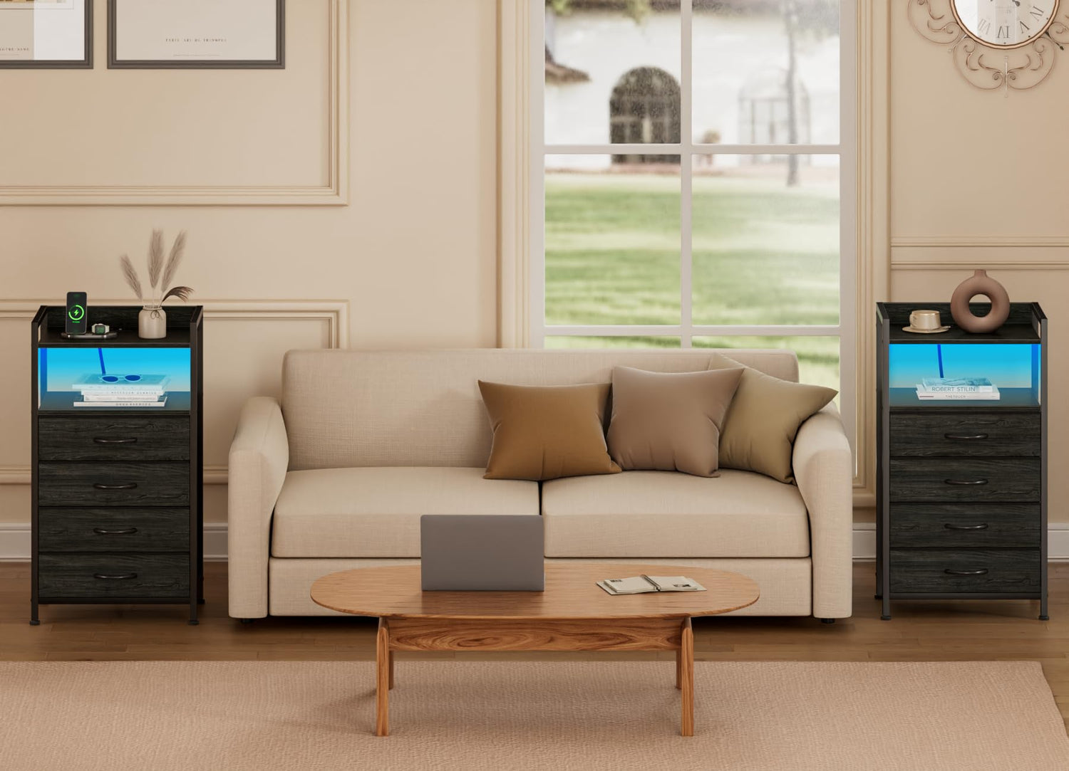 Furnulem Black Nightstand Set of 2, Small Dresser for Bedroom, Tall Night Stand with Charging Station and Led Light, Dresser Organizer Side Table Bedside Furniture, Wood Shelf, Fabric Drawer