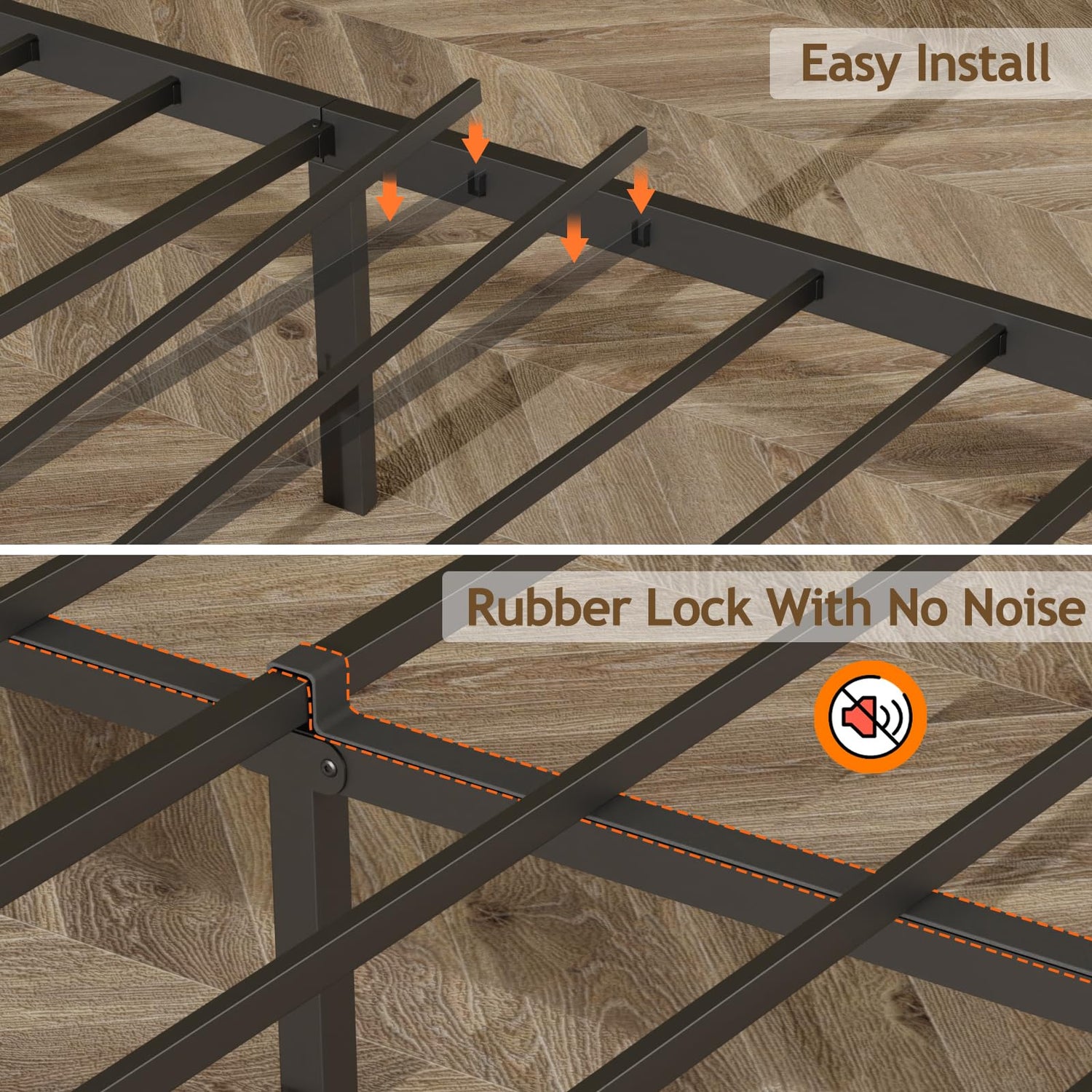 Built for durability, the Furnulem bed frame features a sturdy metal structure supported by 13 heavy-duty slats and 11 legs, making it capable of holding up to 1000 lbs. To ensure a noise-free experience, a memory foam strip is placed along the centre bar, effectively reducing any unwanted sounds.