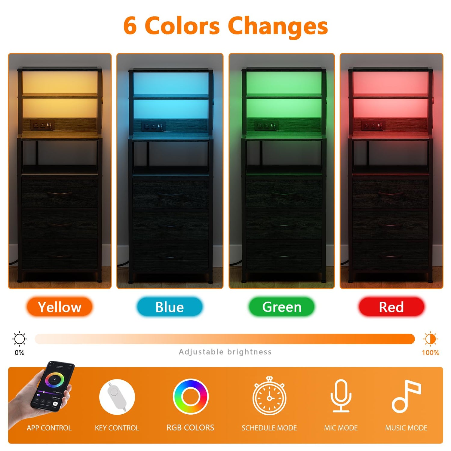 Furnulem Night Stand, Tall Nightstand with 4-Tier Shelves and 3 Fabric Drawers, LED Bed Side Tables with Charging Station, Bedside Table for Bedroom, Hallway, Home Office, Black Oak